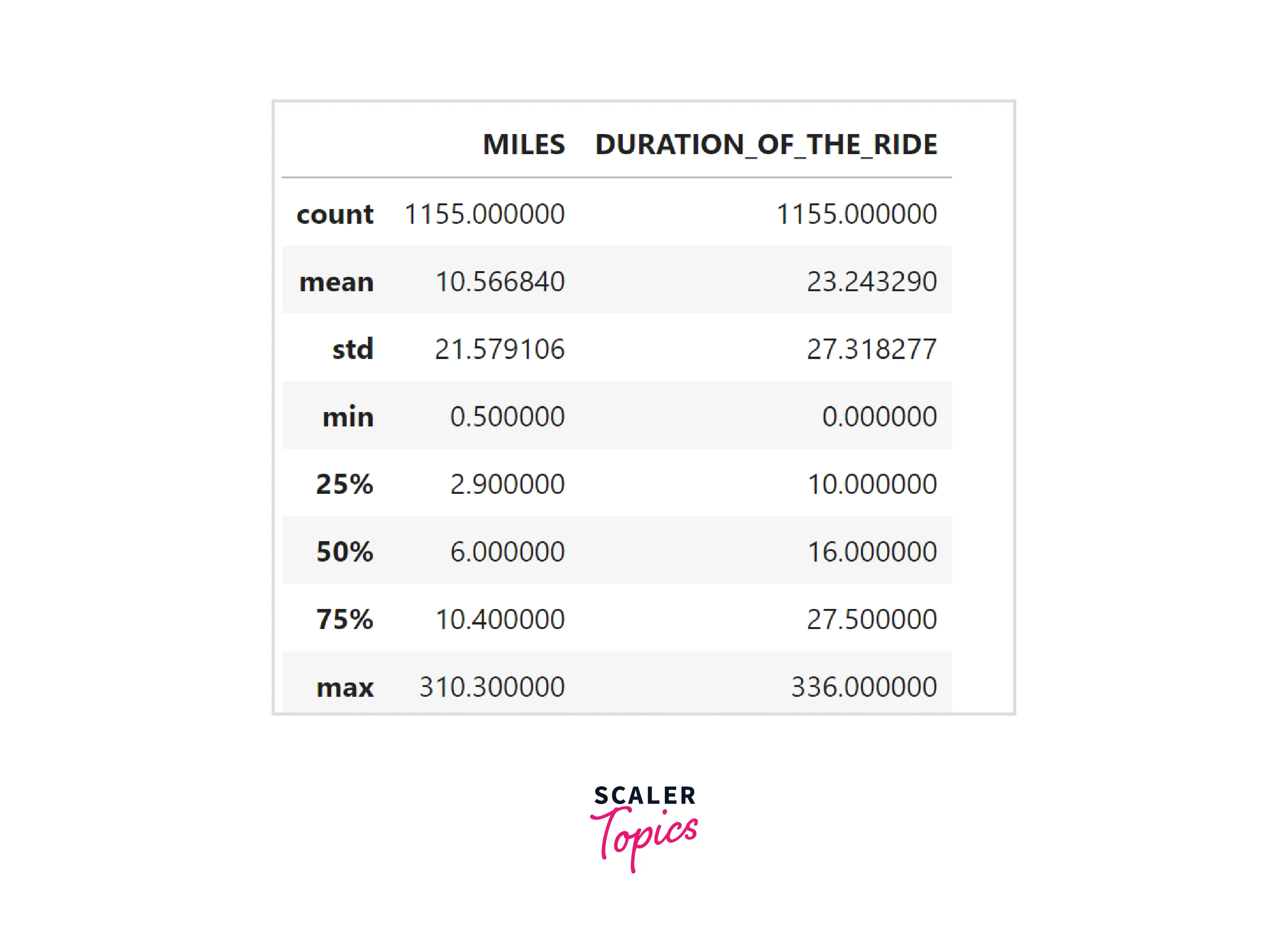 - Let’s explore summary statistics of the numerical features present in the dataset. As we can see below, the mean miles of a ride are 10.56, and the mean duration of a ride is 23 minutes. The maximum number of miles of a ride is 310, and the max duration of a ride is 336 minutes.