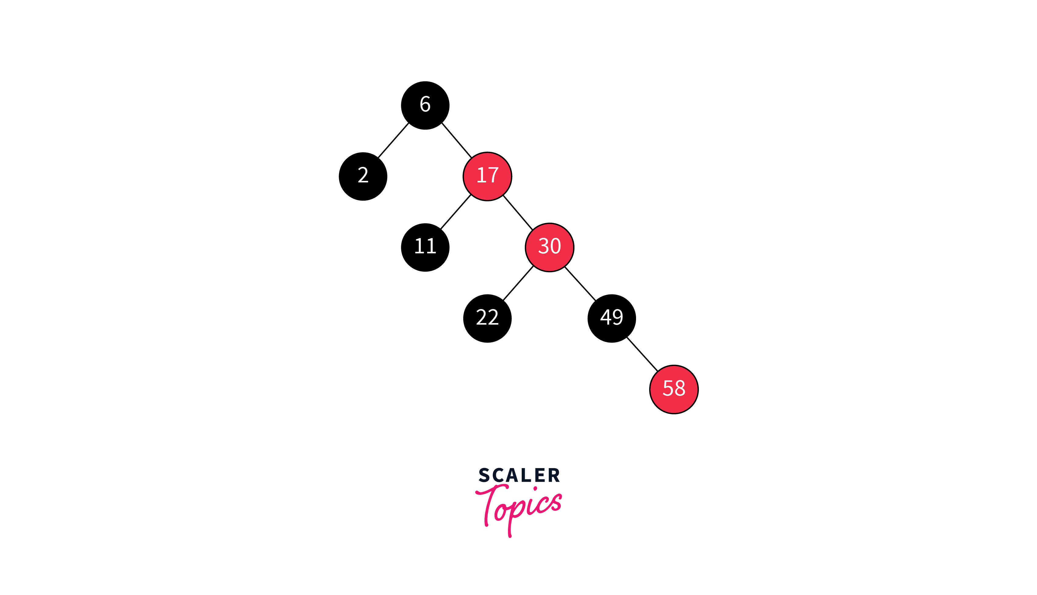 But the problem in above orientation is that two adjacent nodes have red color which violates the property (node 17 and node 30). Since, the node 30 is in trouble, so we check the color of sibling parent's node (i.e. node 2). Node 2 is black, so we apply the RR rotation on (6-17-30) and recolor the node 6 and node 17 as per the rule. Hence, the final tree will become like below: