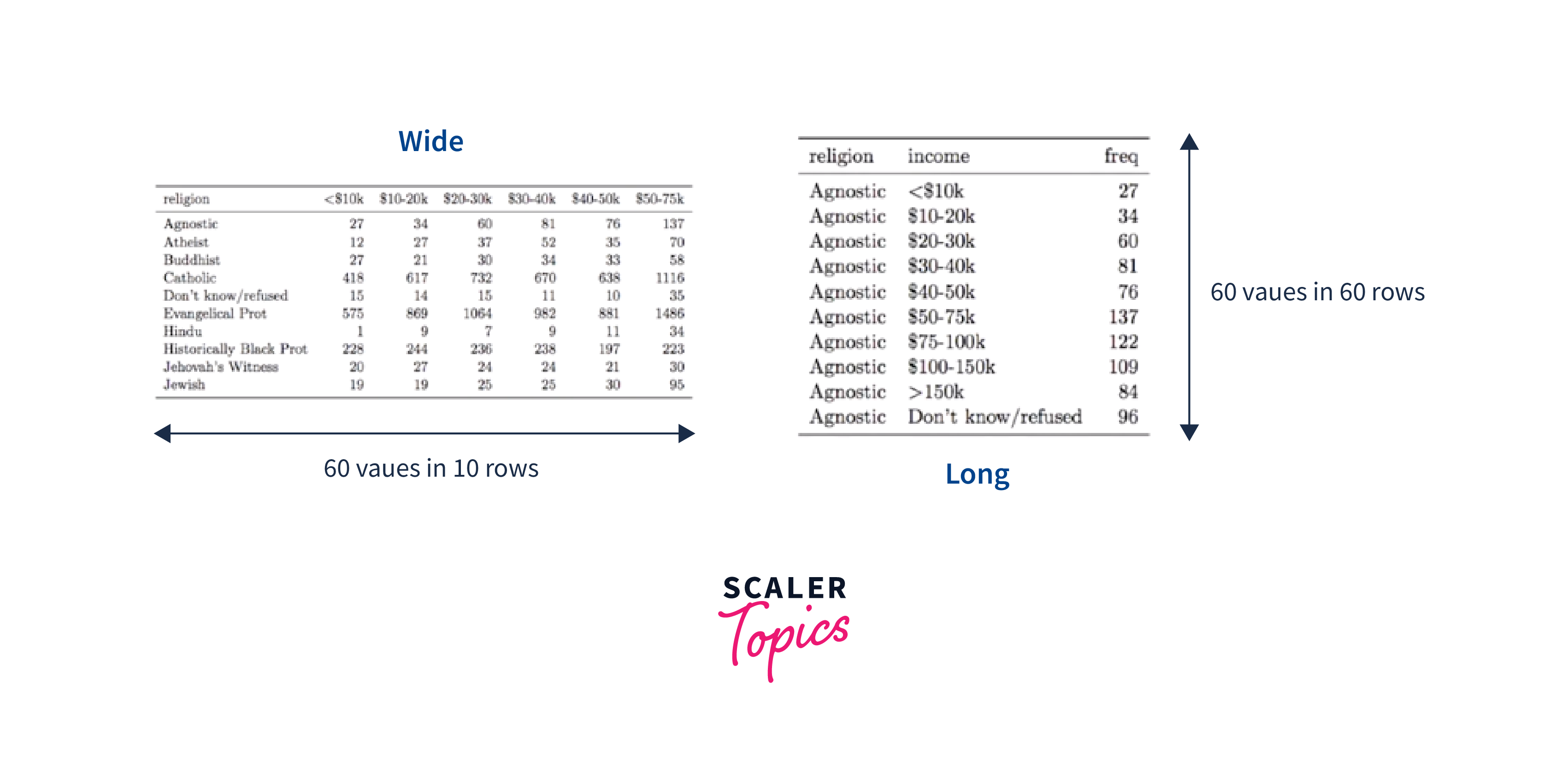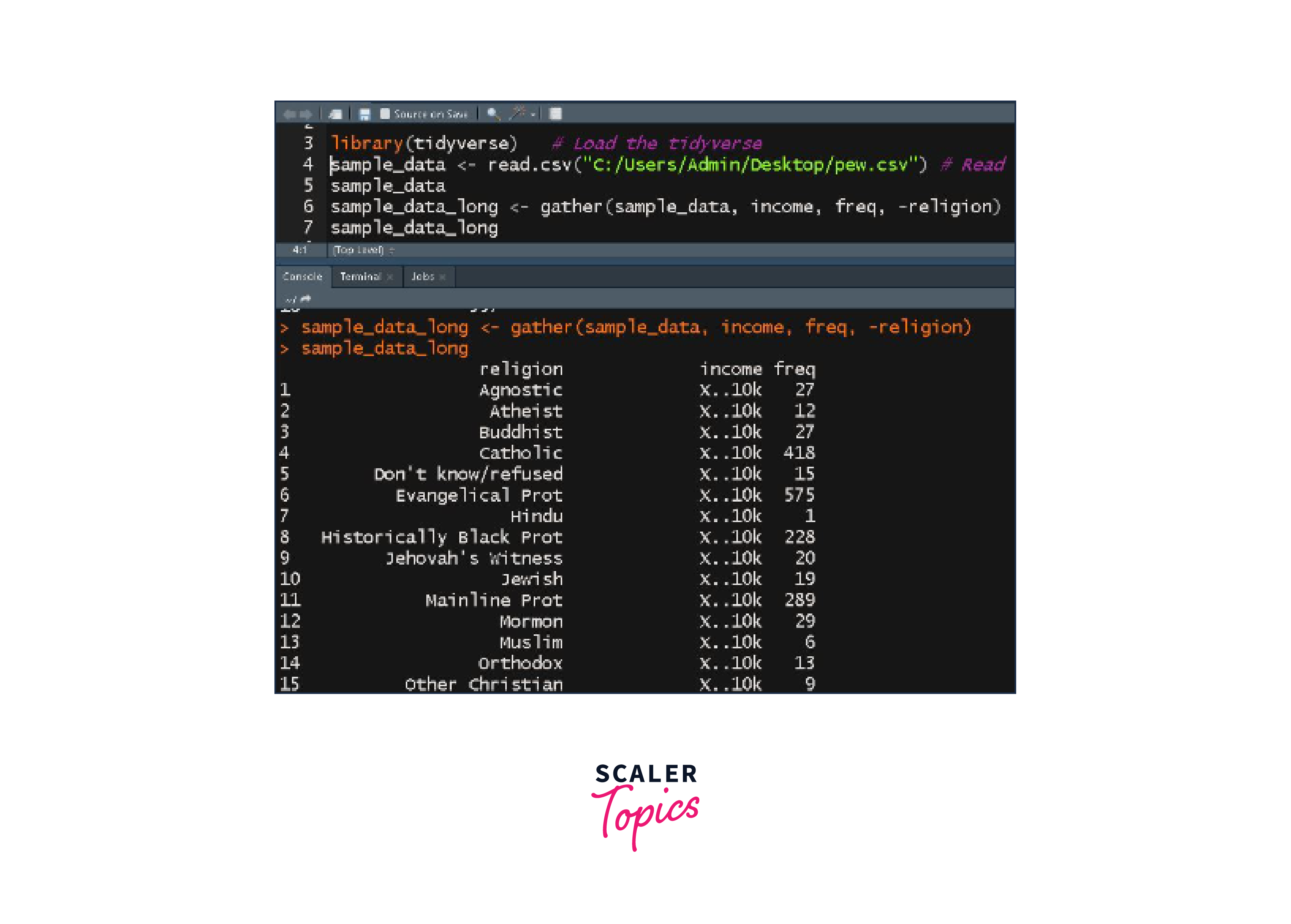 Consider the figure above, where the same dataset is represented in both wide and long formats. This dataset comprises religions and their income classifications. Understanding the distinction between long and wide datasets, let us now explore how to use R tools to convert between these two formats.