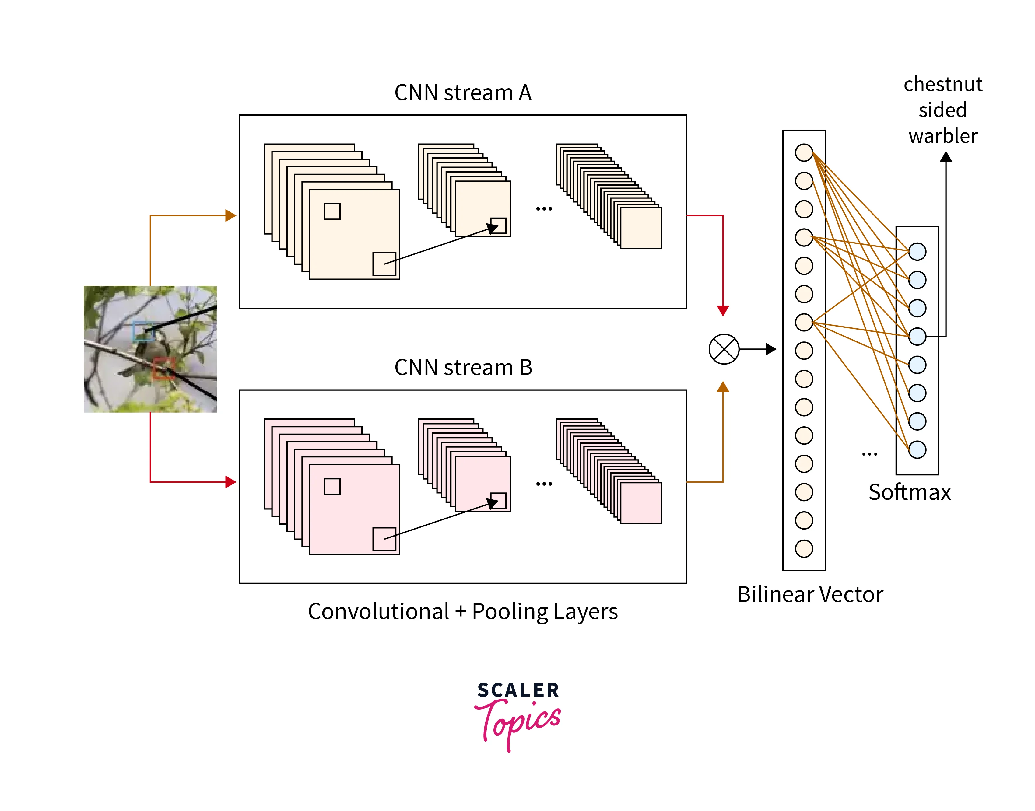 A Bilinear CNN contains 2(or sometimes more) CNN feature extractors, which identify different features. The different feature extractors are combined as a Bilinear Vector to find the relationship between the different features. This is passed through a classifier to obtain the results. For example, If the task was to recognize a bird, One feature extractor would identify the tail, while the other would identify the beak. These two will then come together to infer if the image presented to it is a bird at the bilinear vector.