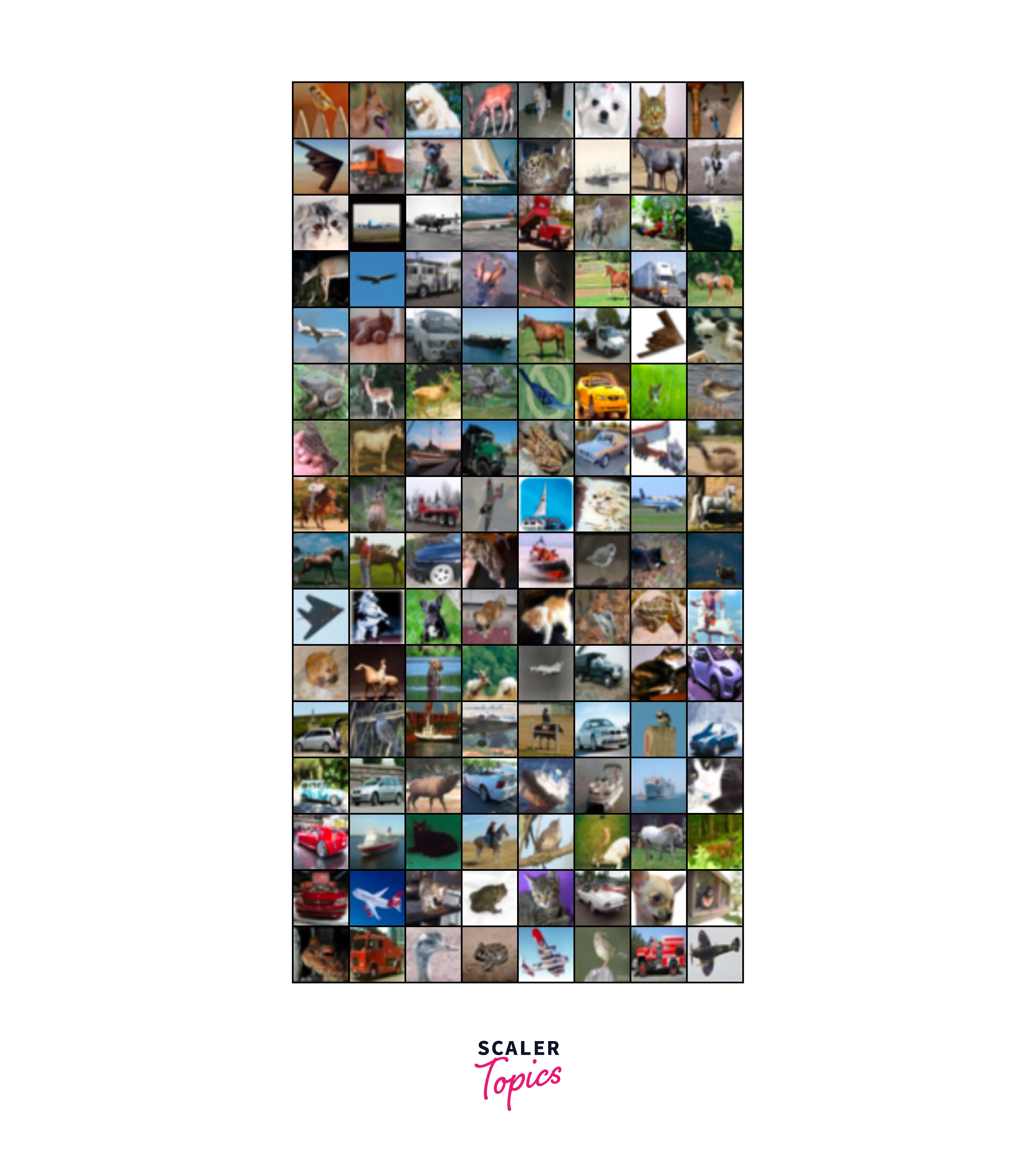 Before using the dataset, it must be loaded and preprocessed. PyTorch has an inbuilt CIFAR10 dataset implementation that we can load directly. If the dataset is being used for the first time, it must be downloaded. Once the dataset is loaded, images are resized to a common size of 64x64x3. Although CIFAR10 is a clean dataset, this resizing step is still important to standardize the images. Finally, the images are normalized and converted to PyTorch tensors.