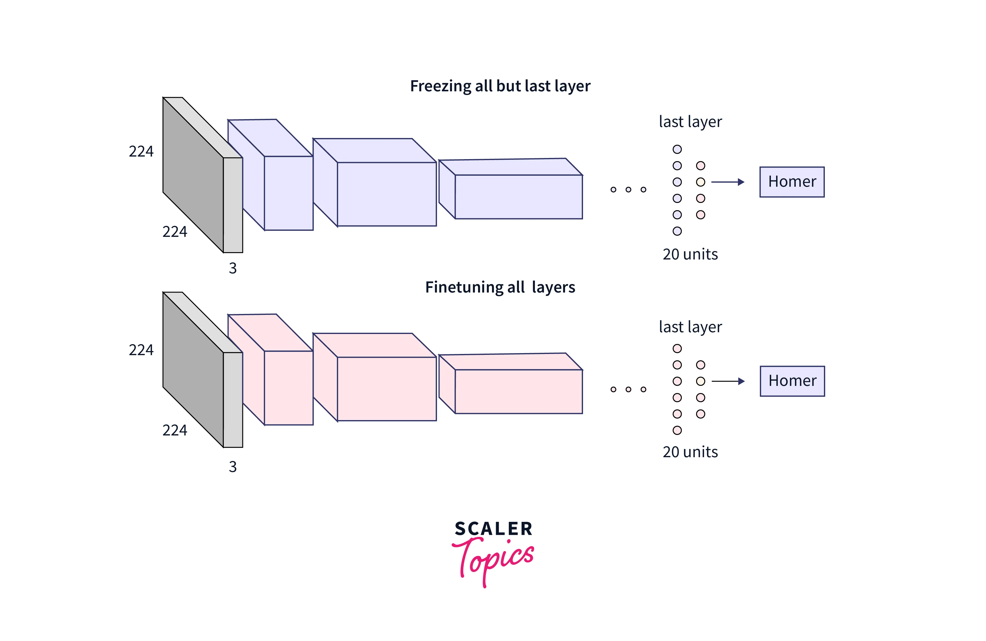 Freezing: In this step, we freeze the weights of every layer that is still present, add new, completely connected layers, and train the system using fewer photos. We employ this strategy when data similarity is high and data size is minimal.