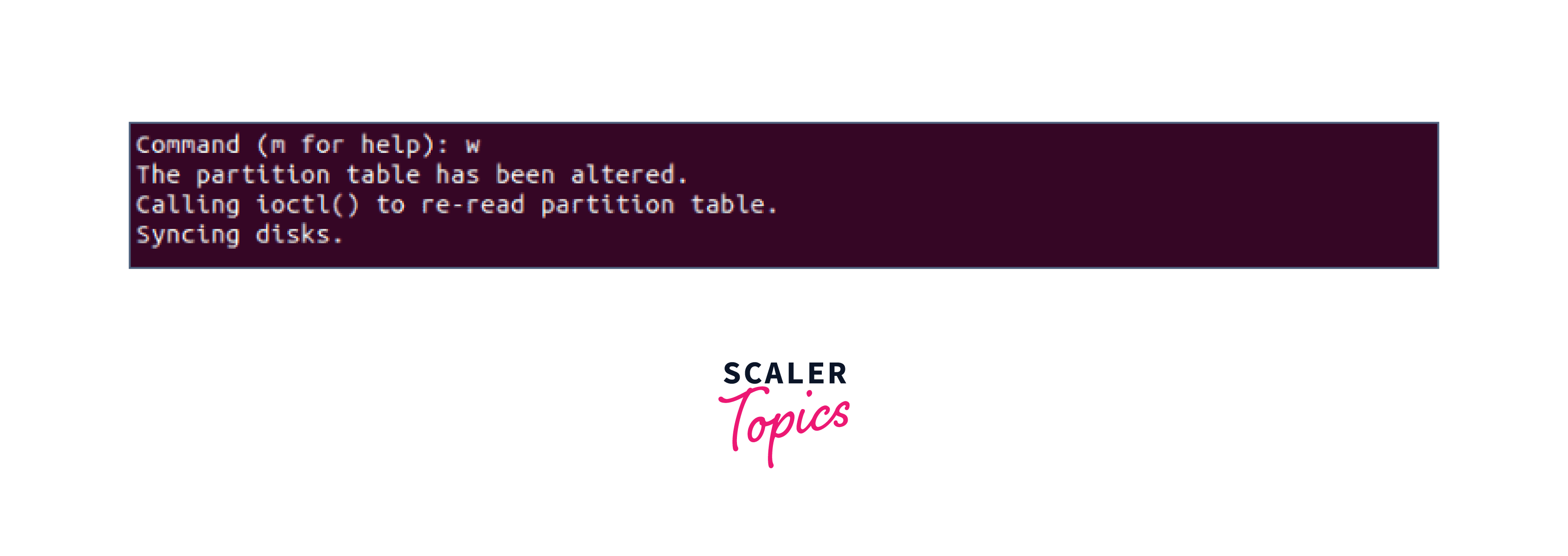 Once you have confirmed the successful deletion of the partition, make sure to save the changes made for the partition table. Inside the fdisk interface, use the w command to write the changes and exit the utility.