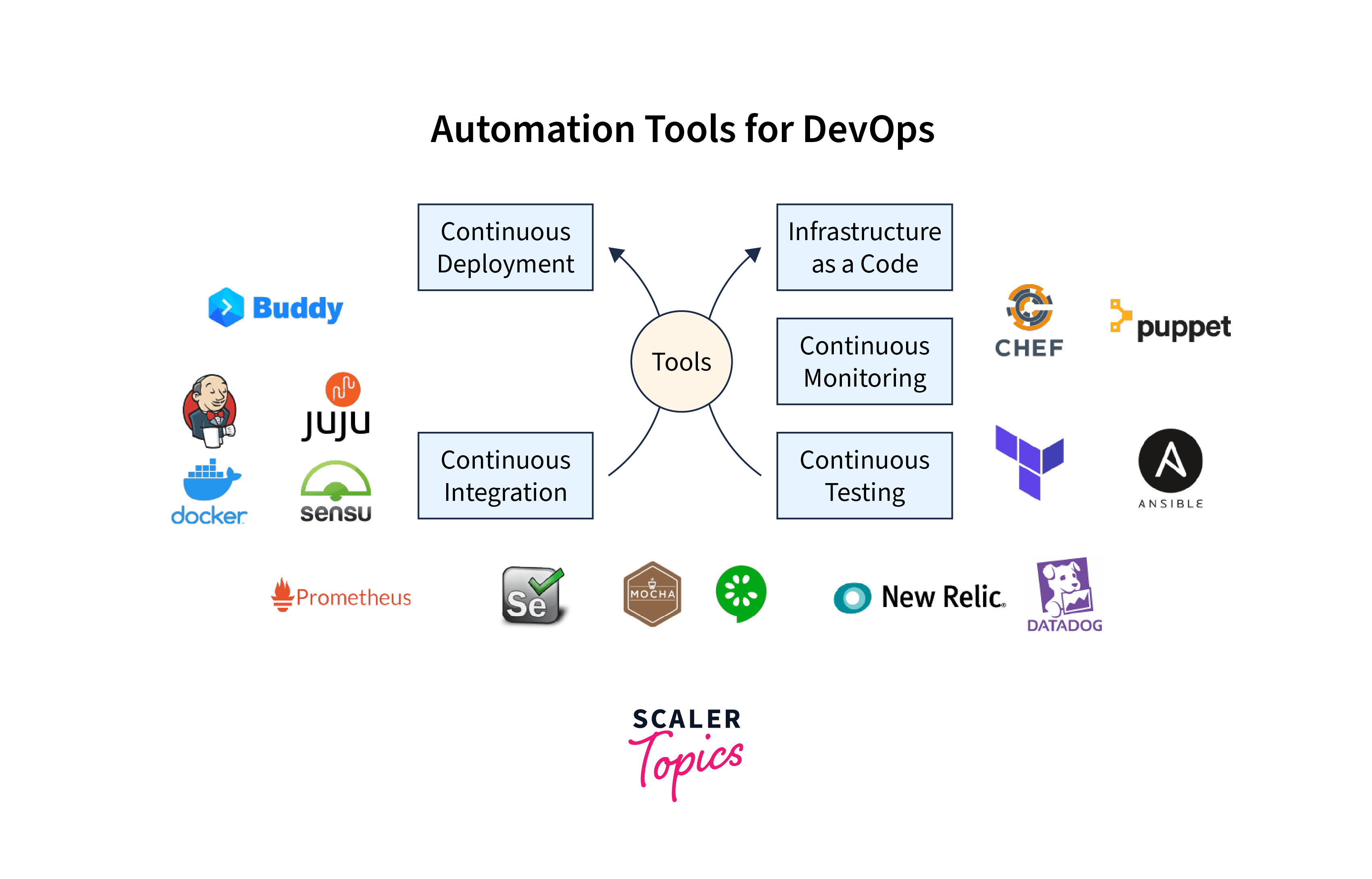- Tools include infrastructure, configuration, deployment, performance, log management, and monitoring.