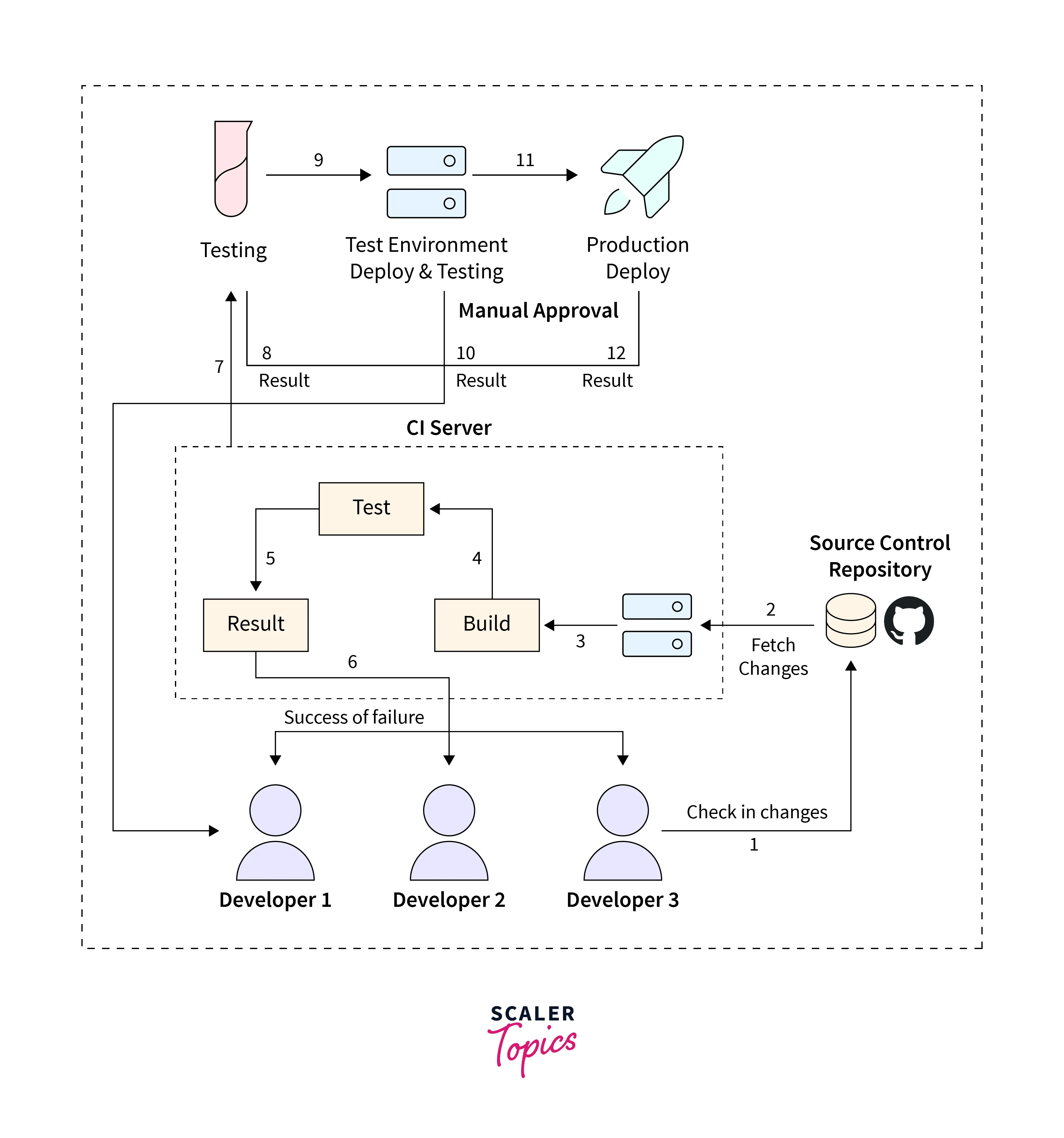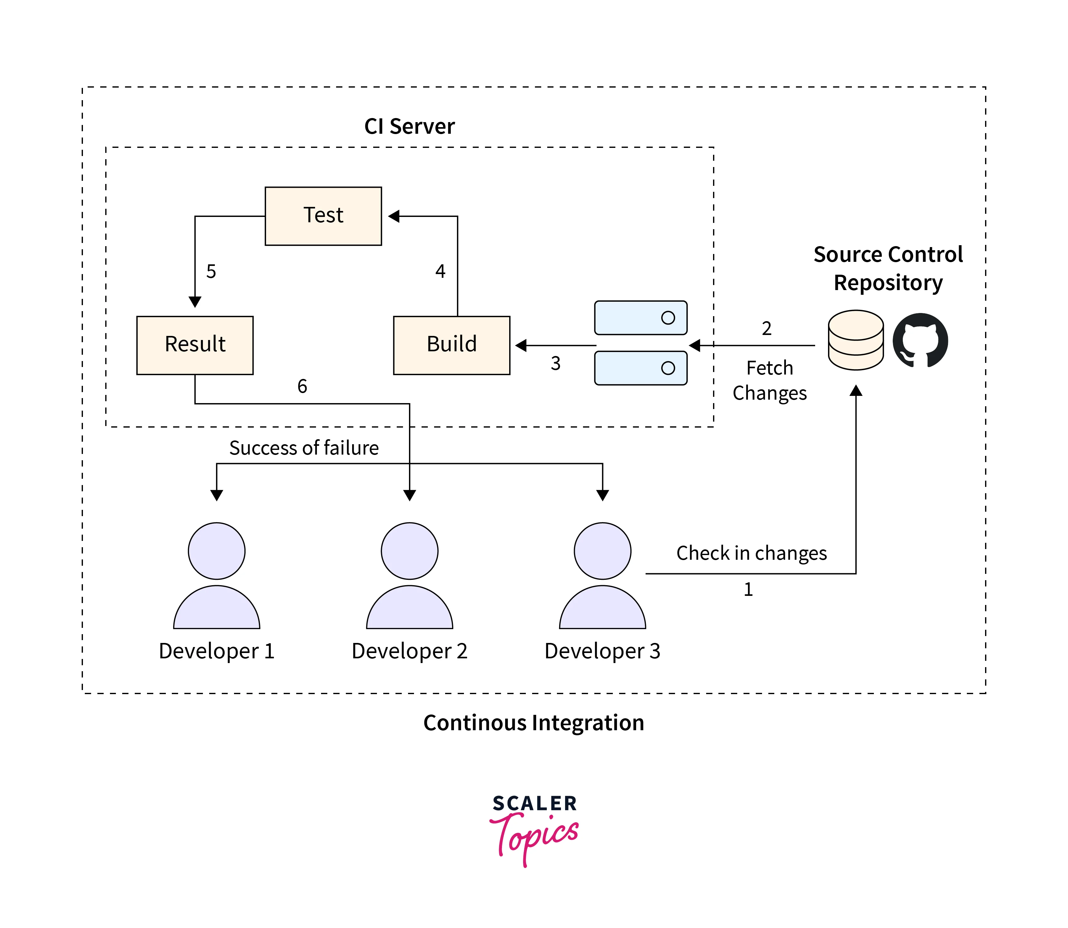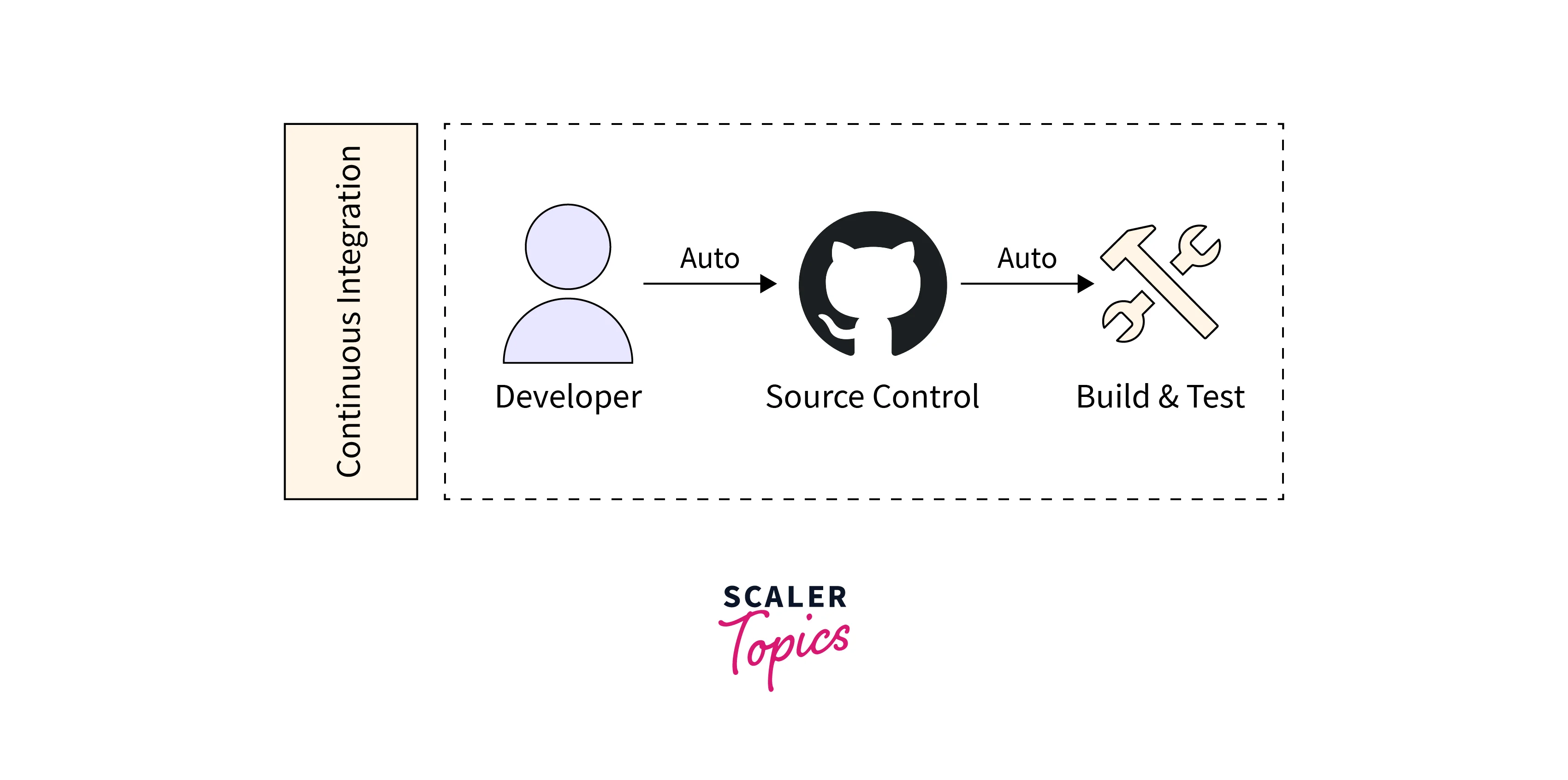 After the development phase, the next phase is continuous integration(CI). Developers regularly commit code changes to a shared repository, typically using version control systems like Git. These code changes are automatically built and tested in a dedicated environment, separate from the development environment, to ensure that the changes are compatible with the existing codebase and do not introduce new issues or regressions.