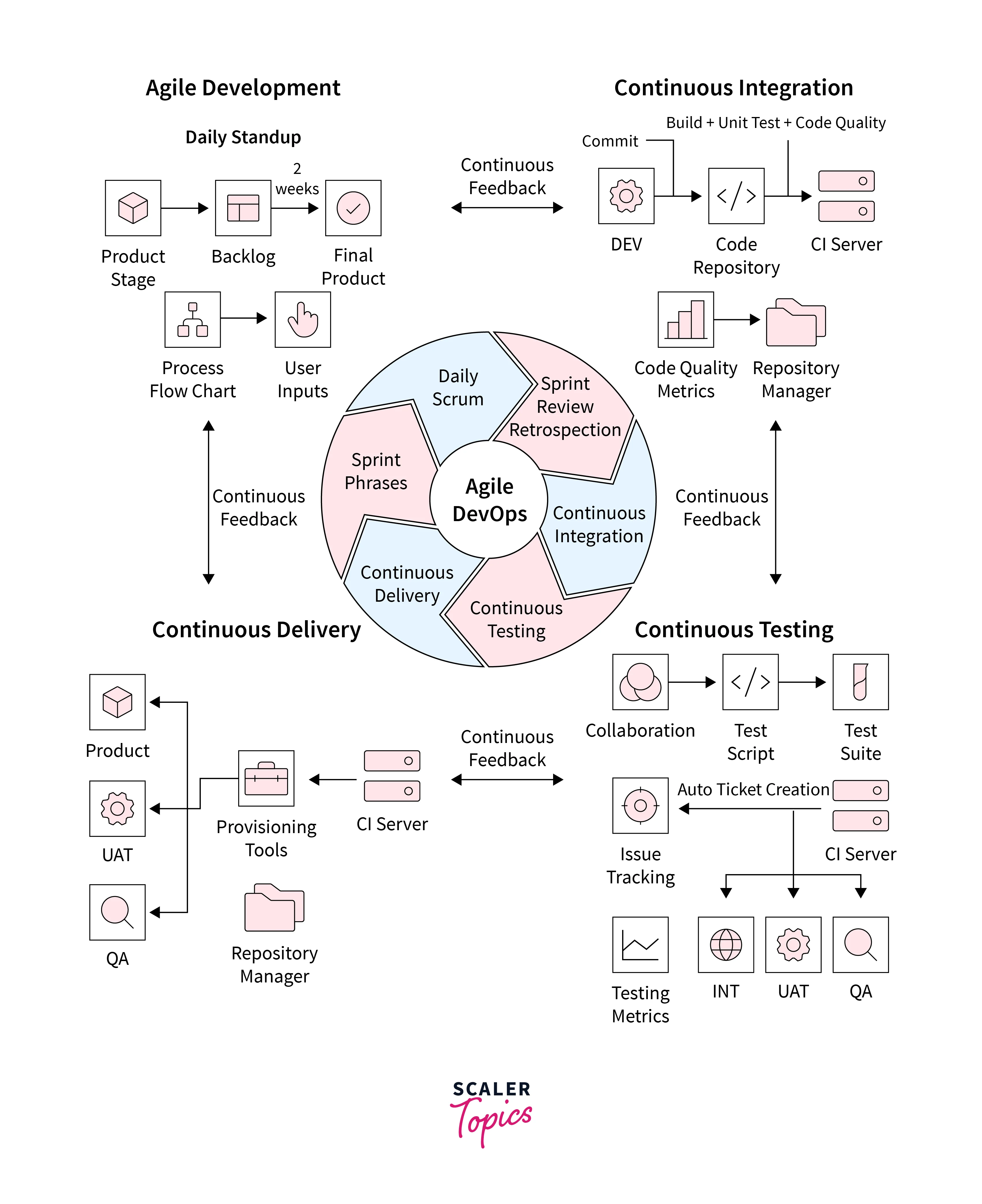 - Continuous Integration (CI) : Continuous Integration and Continuous Delivery (or CI/CD) are used by Agile and DevOps to optimize the delivery lifecycle effectively. Agile ensures discrete bits of work that are connected into a coherent whole and on the other hand DevOps automates the code lifecycle to accelerate release deployments of products based on the business needs. They work simultaneously to create a safe, efficient and dependable pipeline. Some examples of CI/CD Tools are Jenkins, BitBucket, GitHub, Circle CI etc.