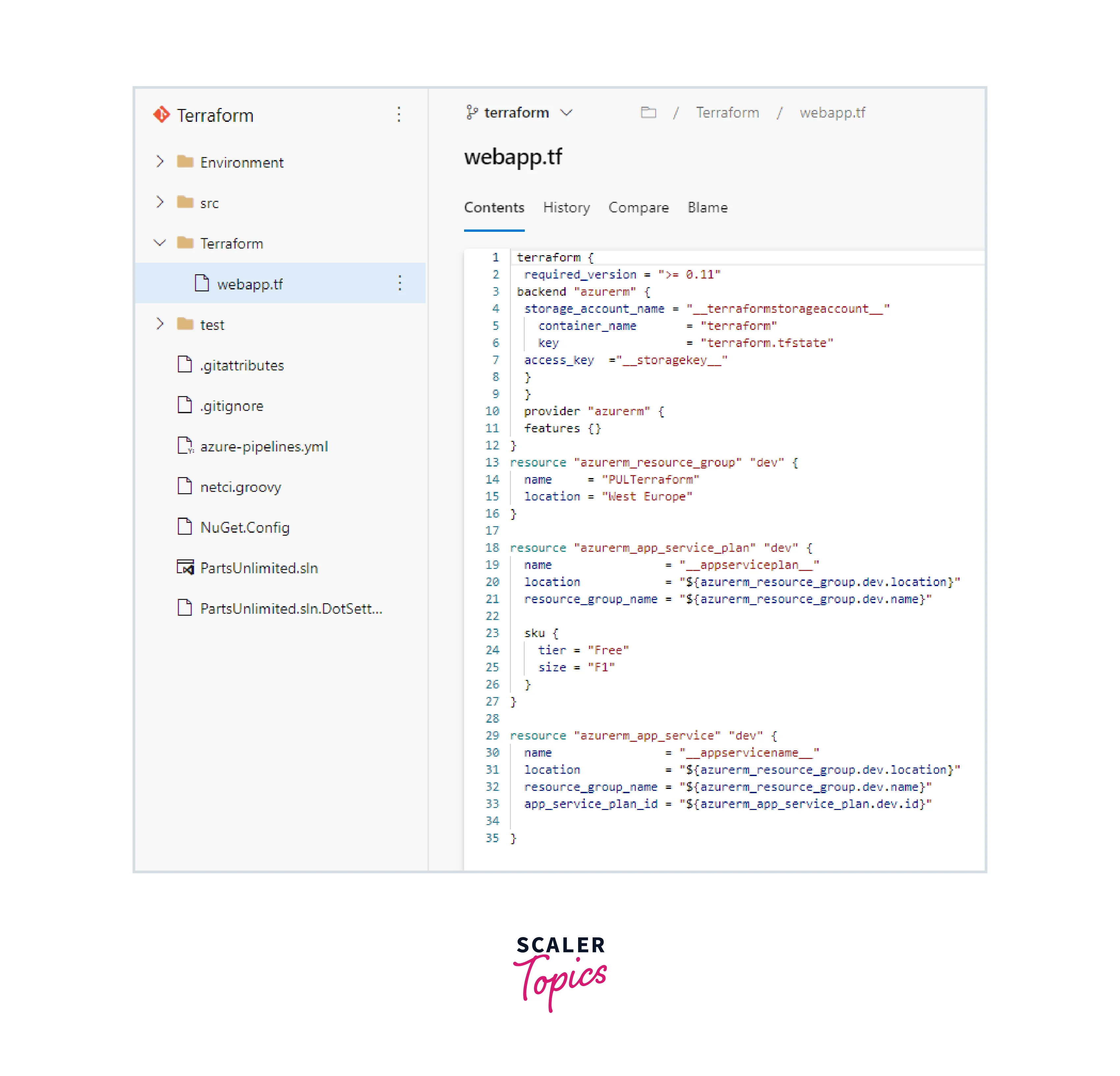 First, examine the Terraform file that enables the deployment of the Azure Resources for the PartsUnlimited website.
