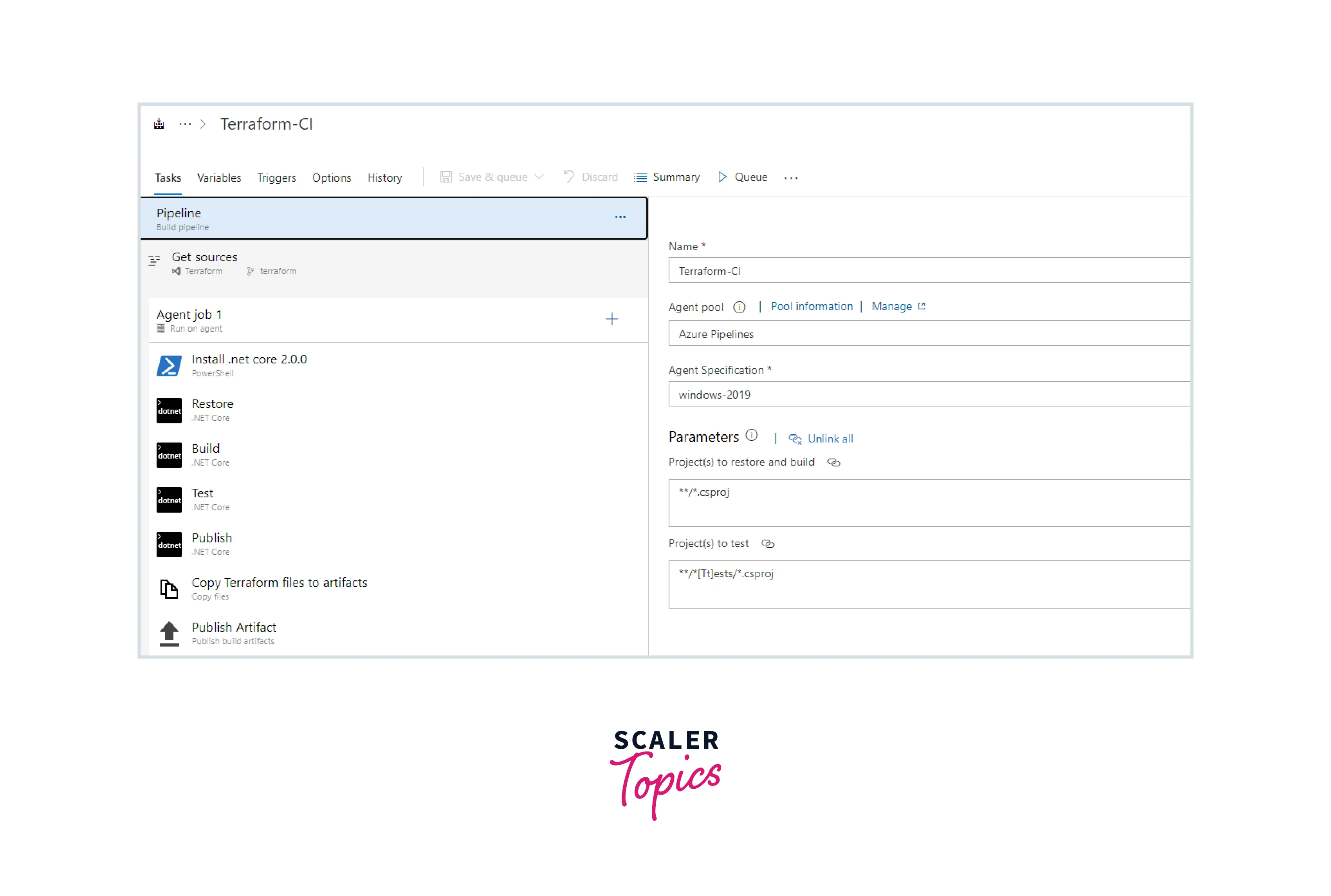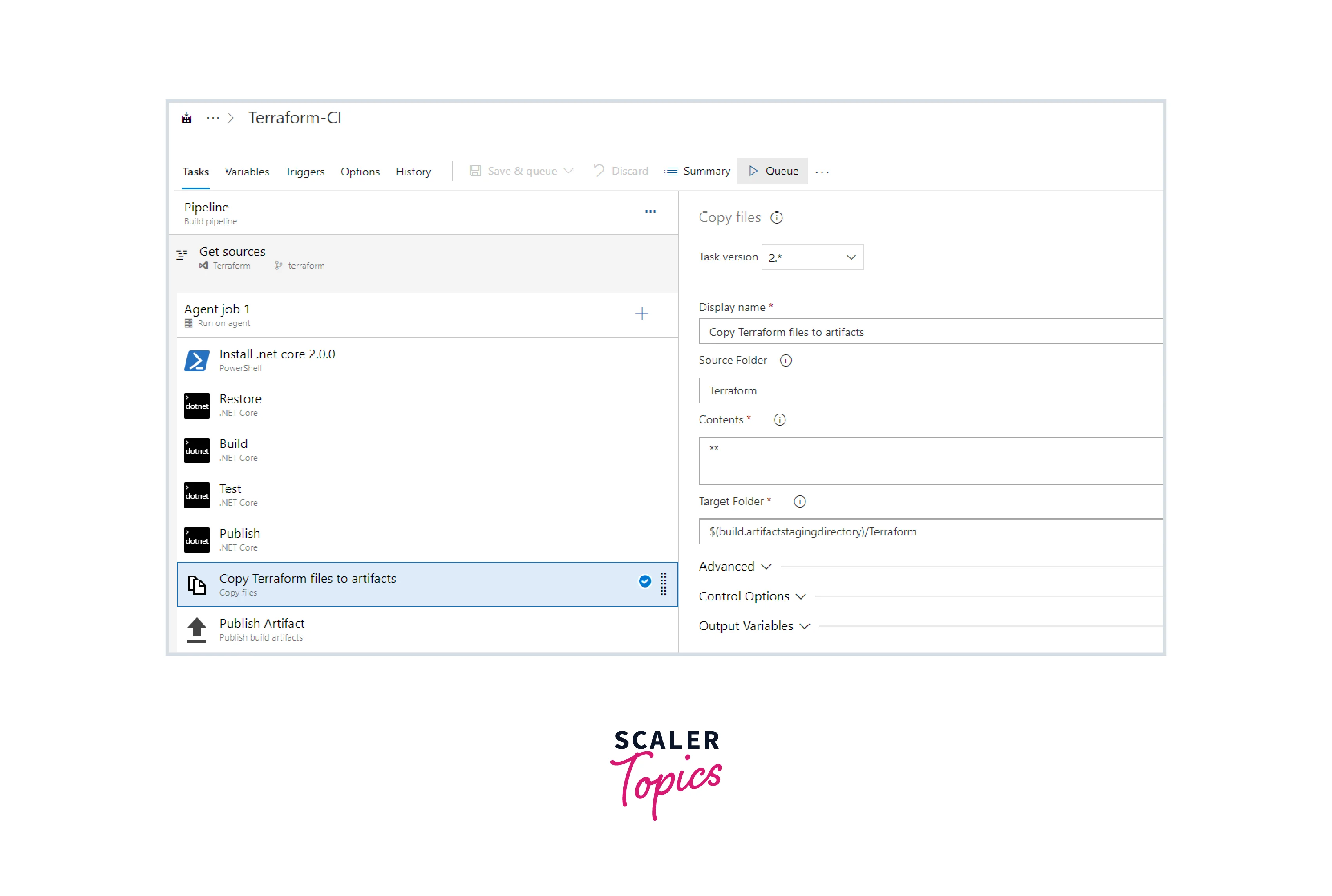 - Besides building the application, we also need to publish Terraform files that include the build artifacts for the CD process. So, the Copy files task has been created to copy the Terraform file to the Artifacts directory. Click on Queue.