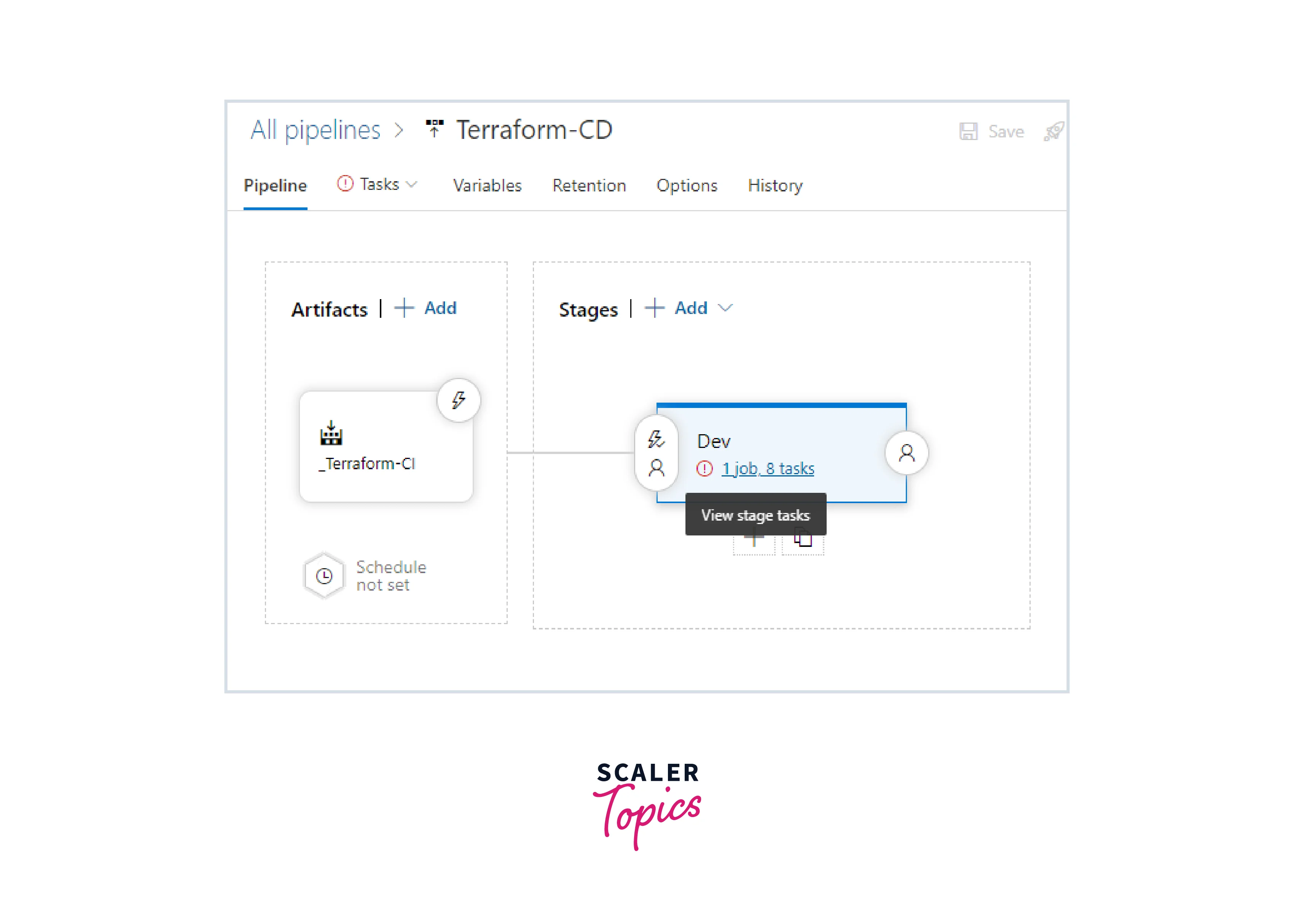 - To view the pipeline tasks, choose Dev stage and click Display stage tasks.