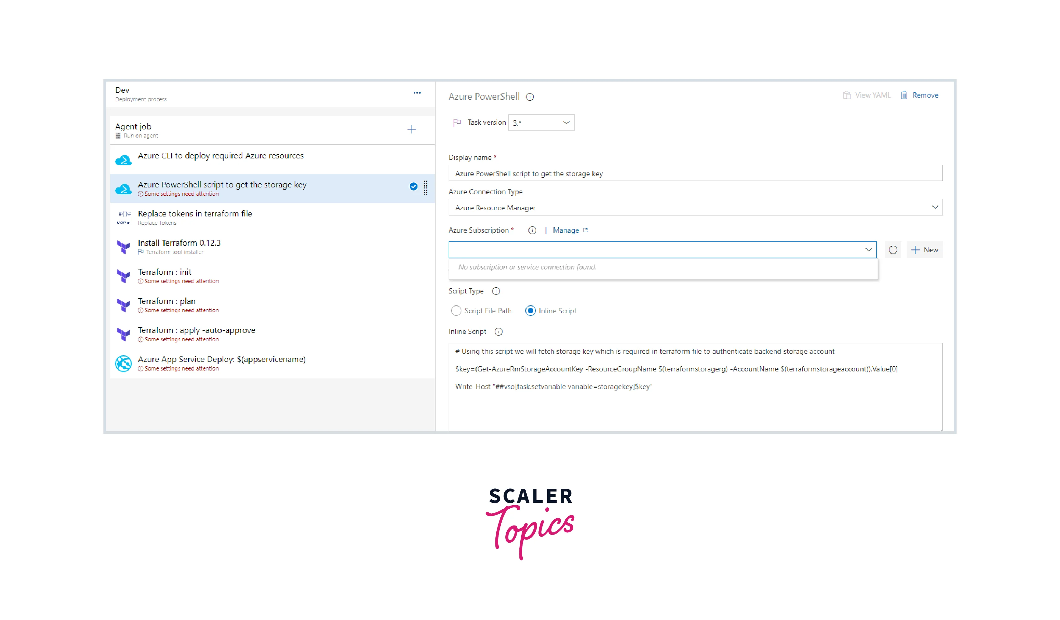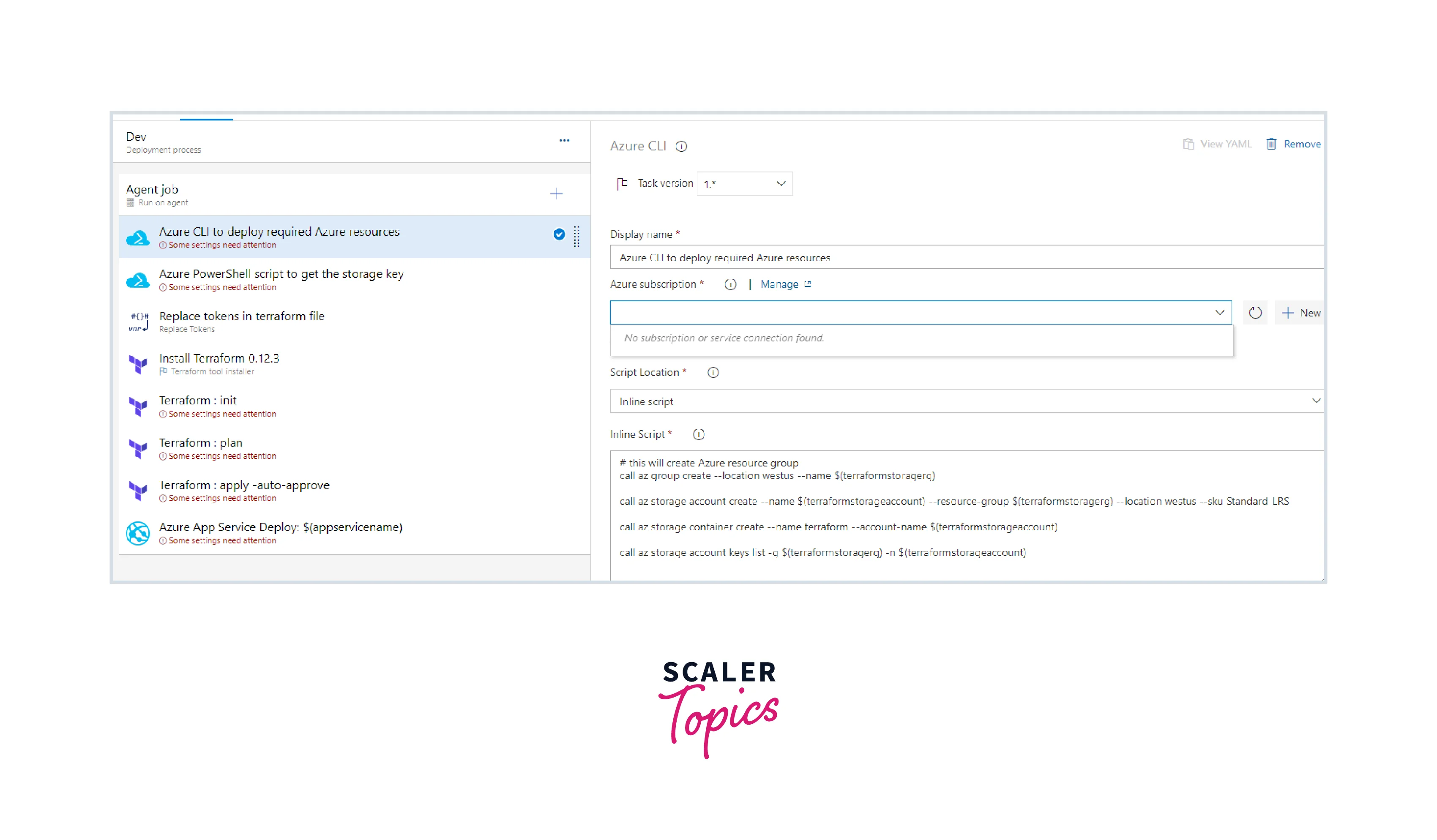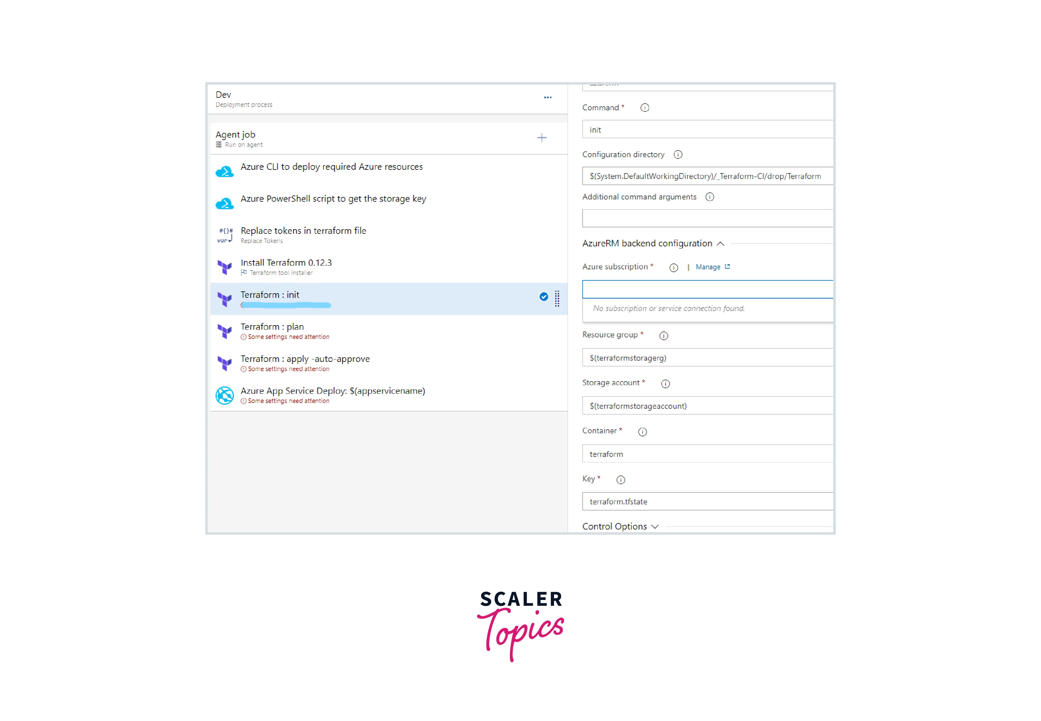 - Next, verify with the Azure subscription in the Terraform init task and fill in the container's name as terraform.