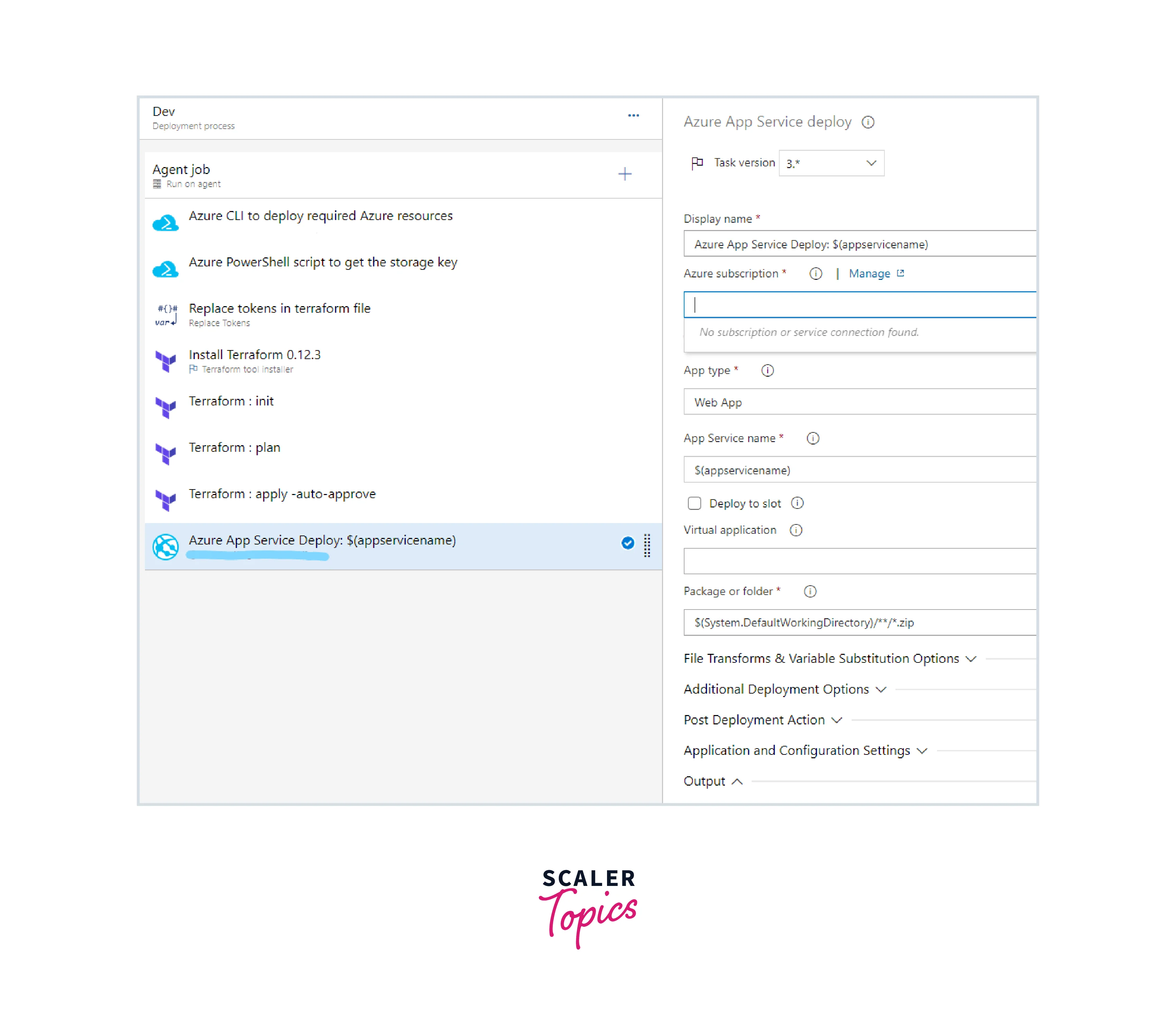 - Choose the Deploy task for Azure App Service. From the drop-down menu, choose Azure service connection.
