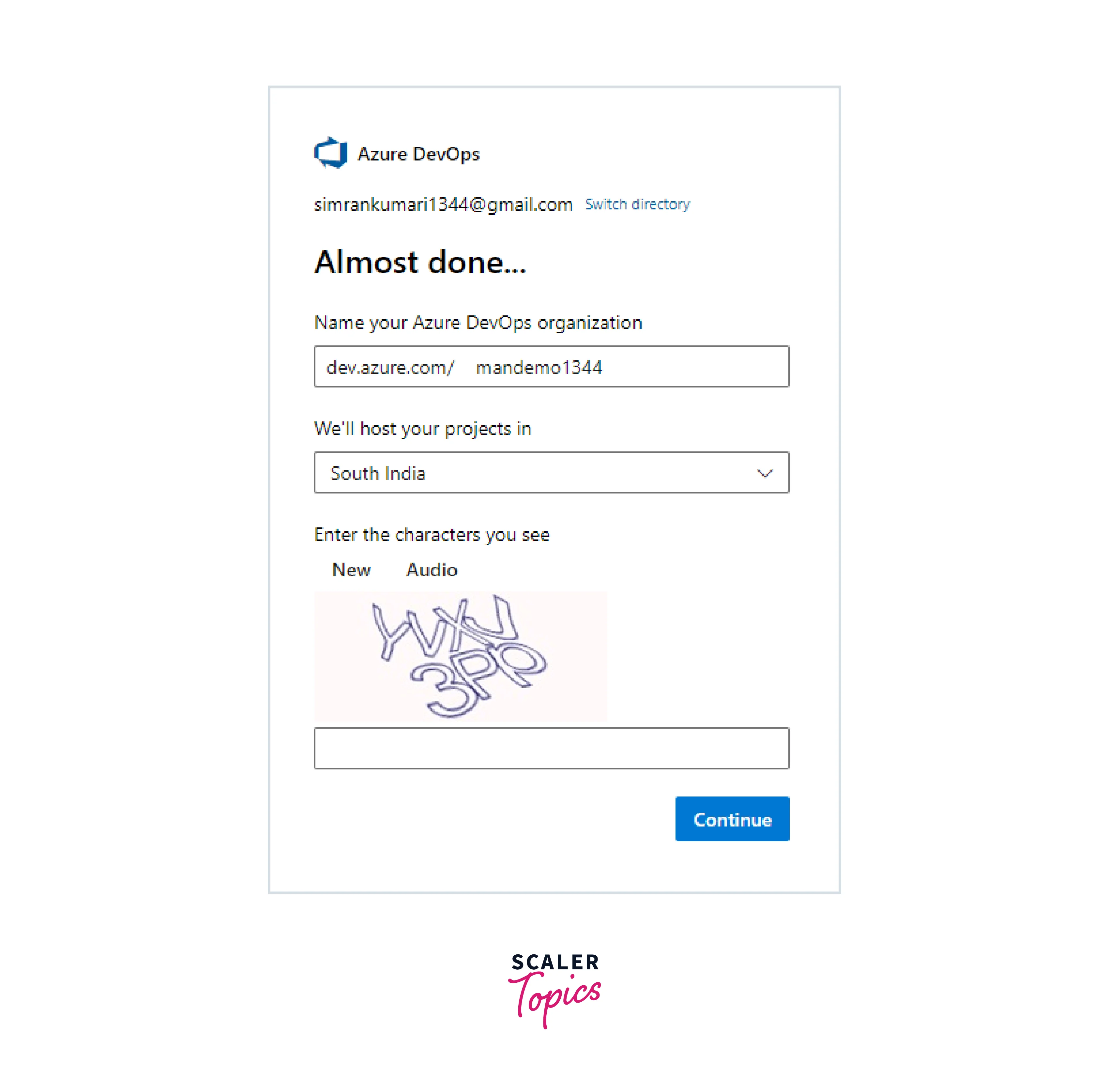 In the following form, fill in other details like the organization name and captcha, and click Continue again.