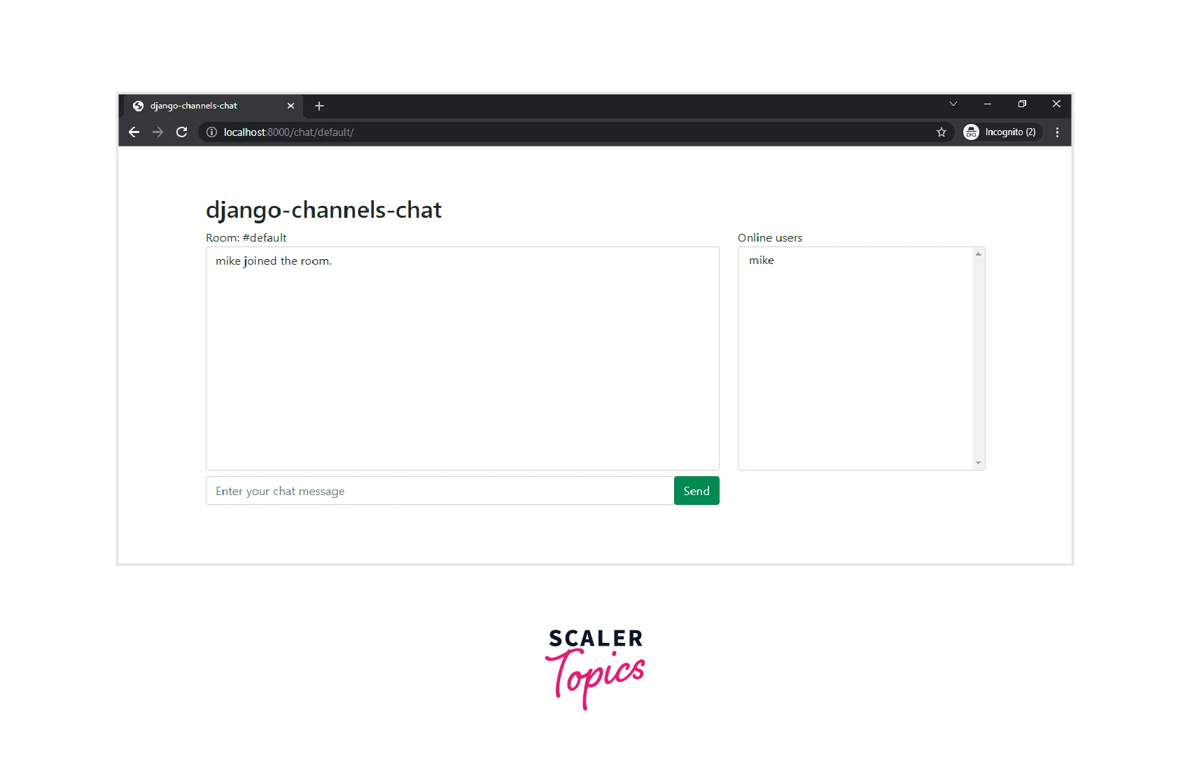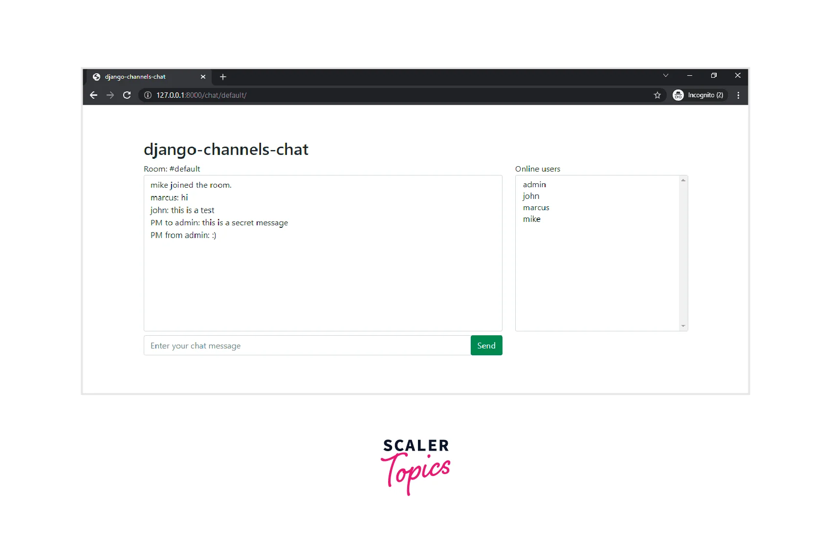 Then open both browsers and go to http://localhost:8000/chat/default. Click on one of the associated users to send them a private message.