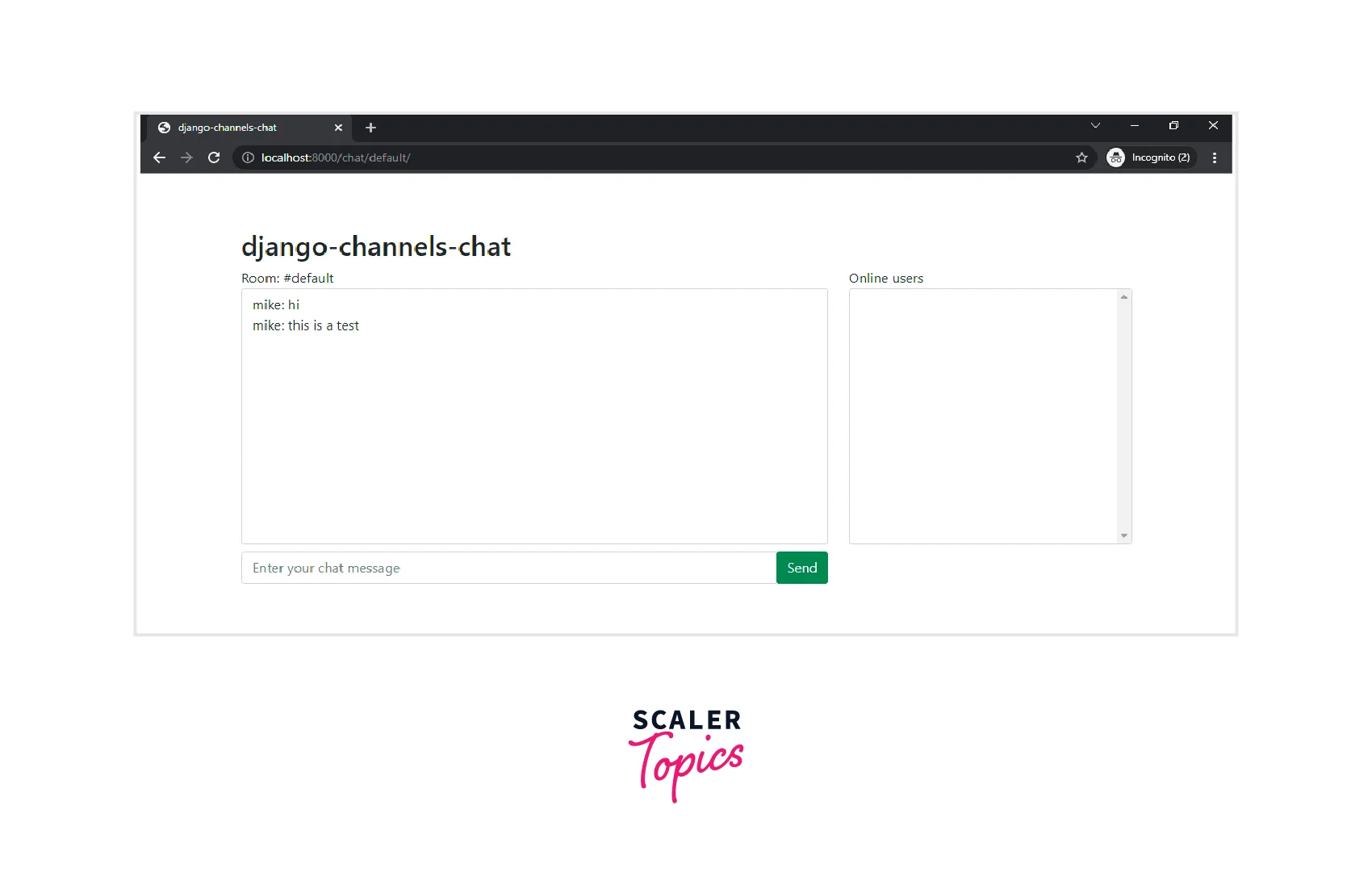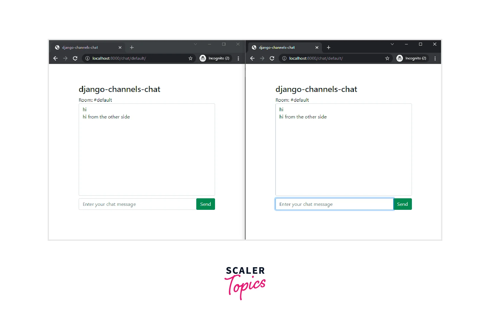 Run the development server to test. Next, open two private or incognito browser tabs and go to http://localhost:8000/chat/default/ in each one. You ought to have the ability to send messages: