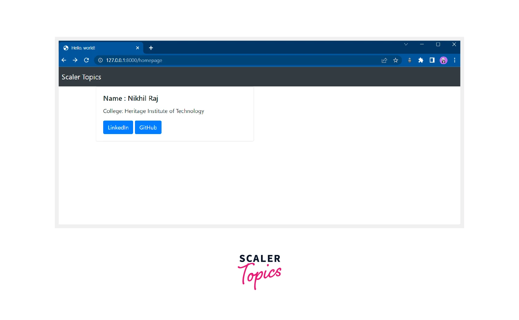 For this article, let us create a Django single page app, displaying the profile card of various users. We will create a list of dictionaries, containing data of various users including name, college, LinkedIn URL, and GitHub Url.