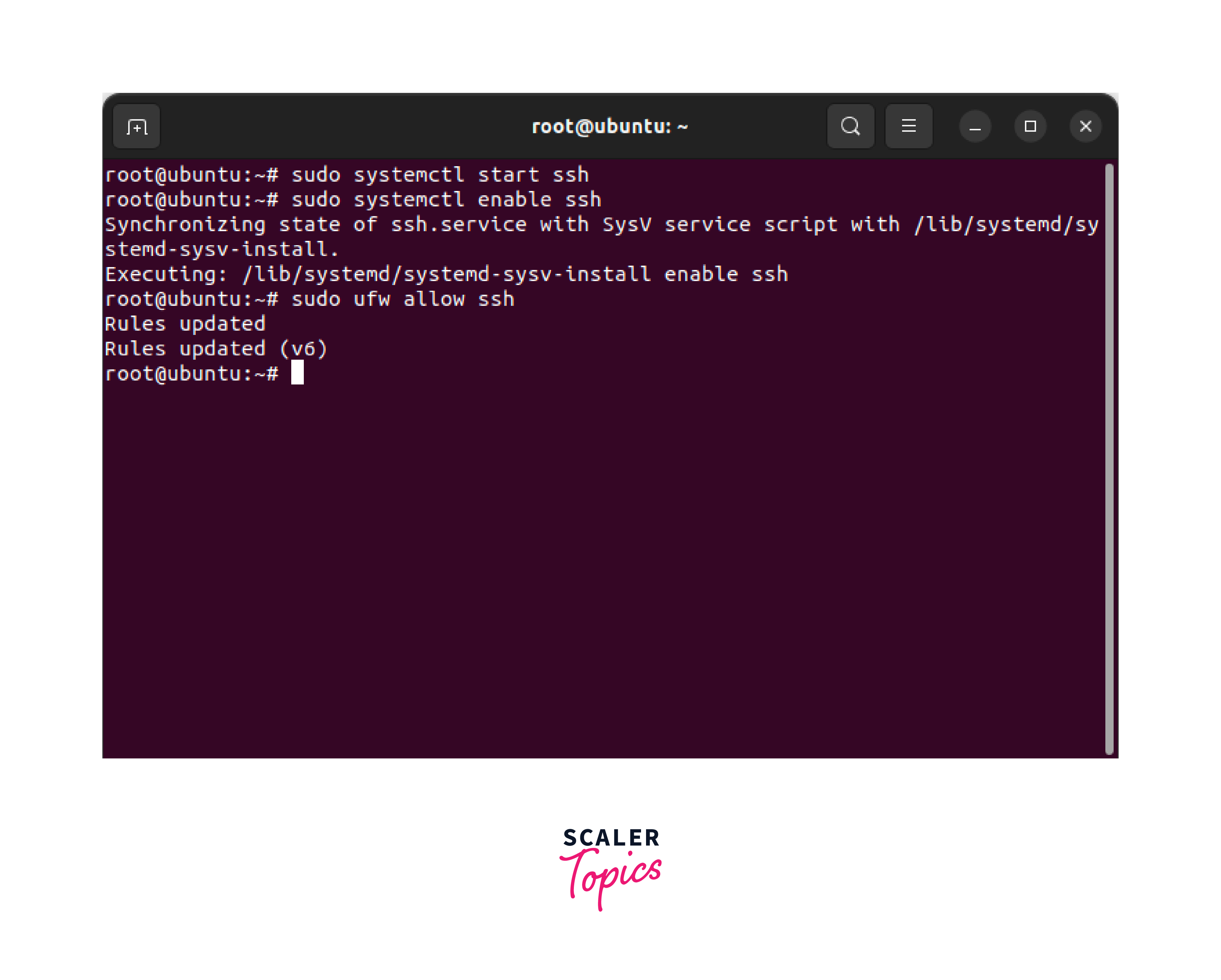 Ubuntu's UFW, which stands for "Uncomplicated Firewall," is enabled by default. If you are using a firewall, you will need to configure it so that SSH connections can pass through it. In order to enable SSH in Linux, you will need to run the following command.