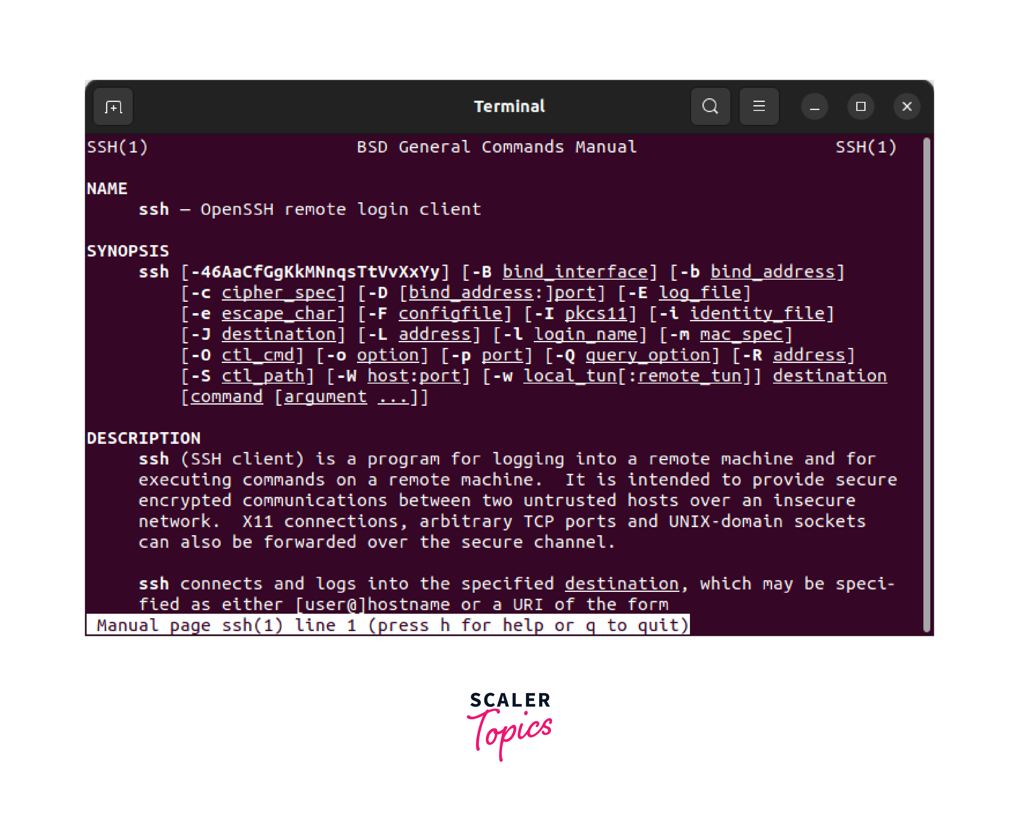 If the SSH client is installed, you will see the SSH prompt along with instructions regarding its usage. If the SSH client is not installed, you will get an error message saying "command not found," which indicates that you need to install it.