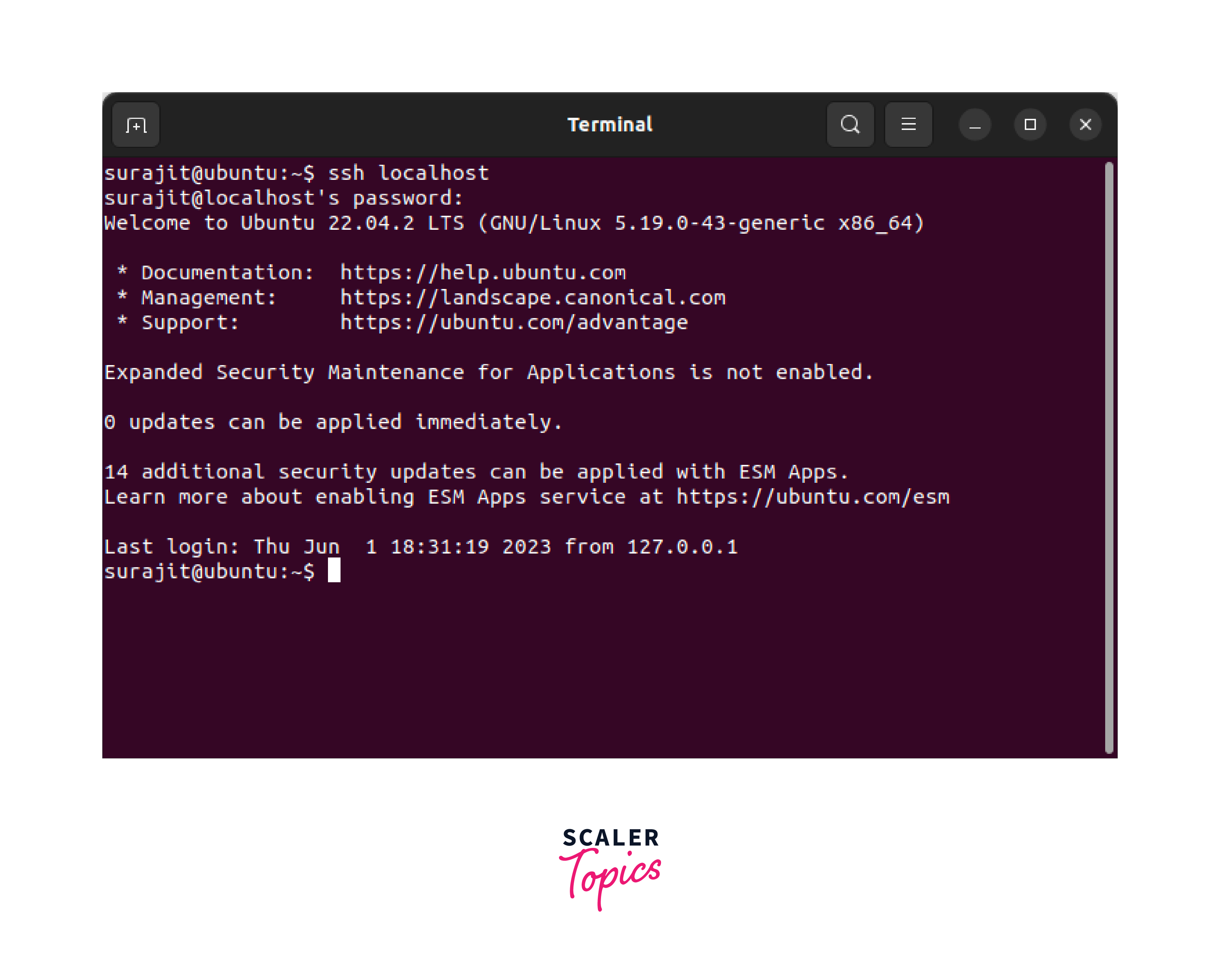 If the connection is successful, you will be asked to enter your username and password, and then you will be logged into your own system over SSH. You can terminate the SSH session by typing the exit command into the terminal.