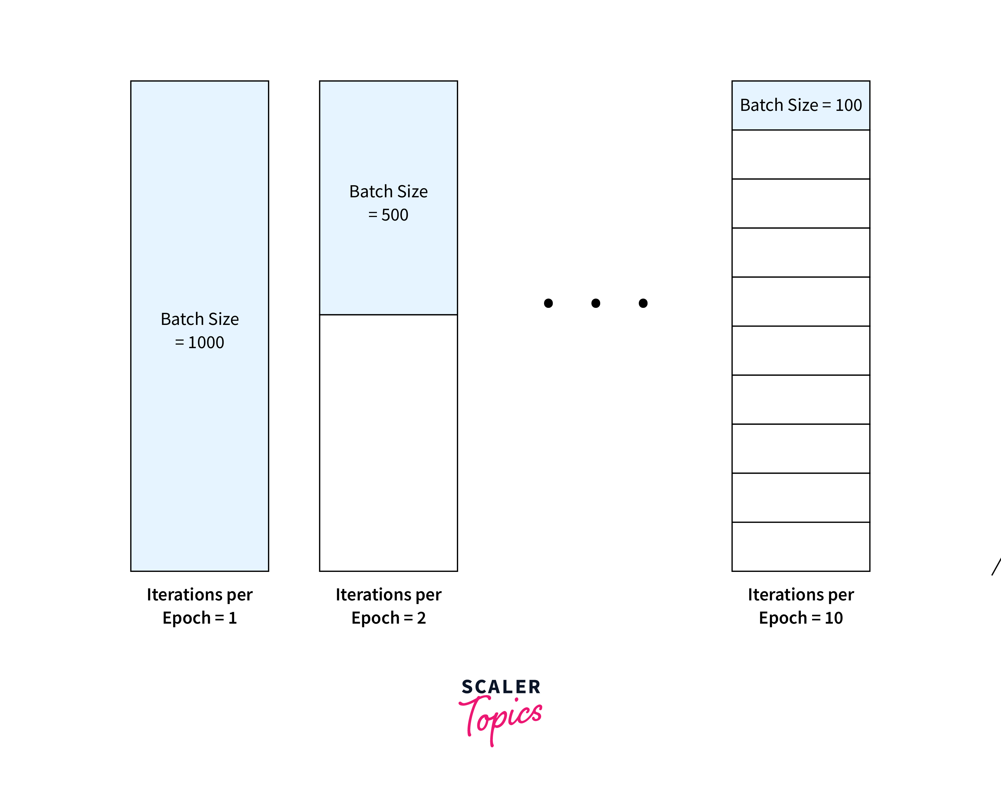 Imagine training a deep learning model on a dataset consisting of 50,000 images for image classification. To manage memory resources and speed up the training process, you might choose a batch size of 100 images. This approach means that the dataset will be divided into 500 batches (50,000 divided by 100), with each batch containing 100 images. During each iteration of the training process, the model will process one batch, adjust its parameters based on the calculated loss, and then move on to the next batch. This cycle repeats until the model has processed all batches, marking the completion of one epoch.