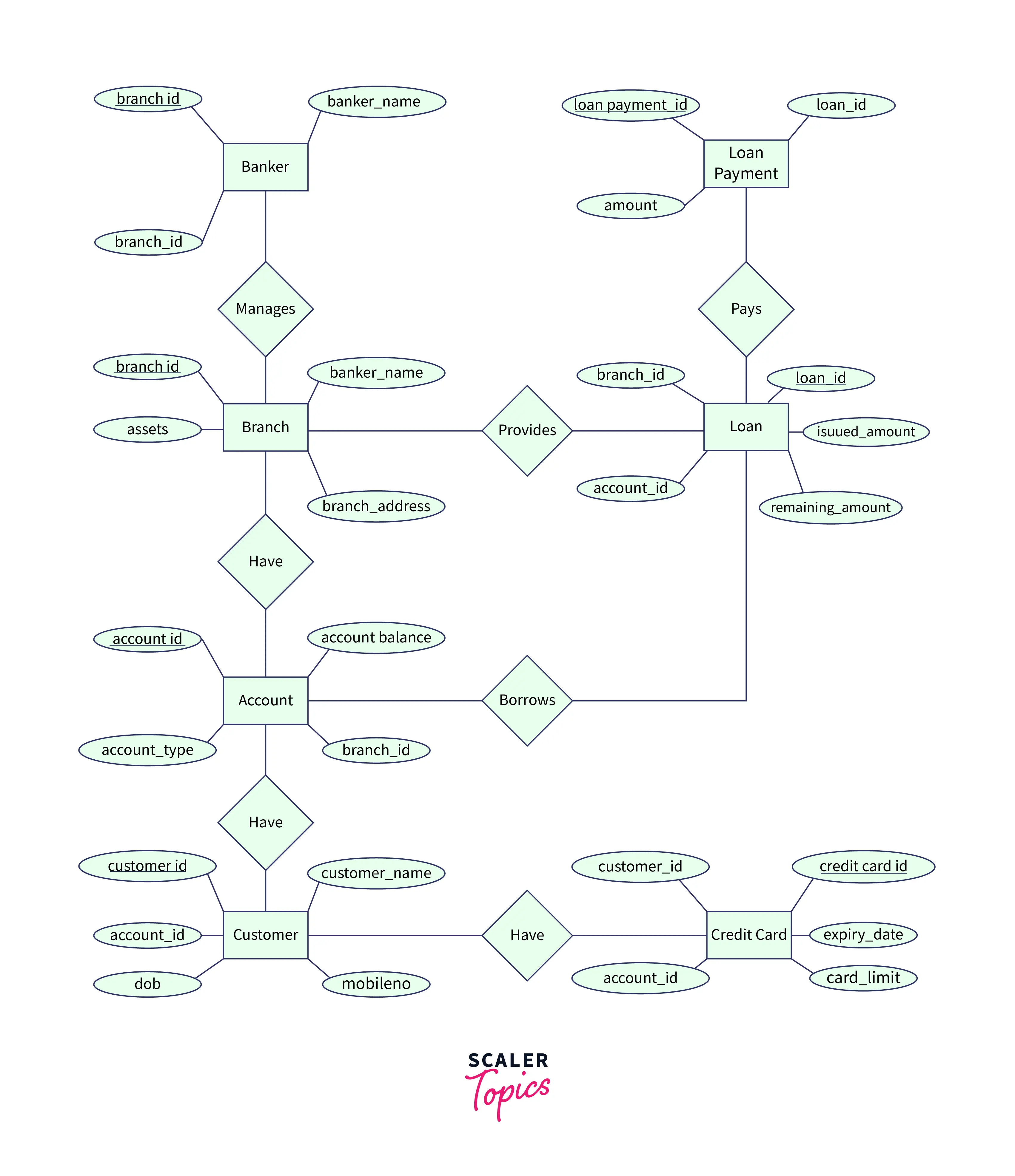 For example, there is an arrow from Banker to Branch which means there is a property branch_id which refers to the Branch.