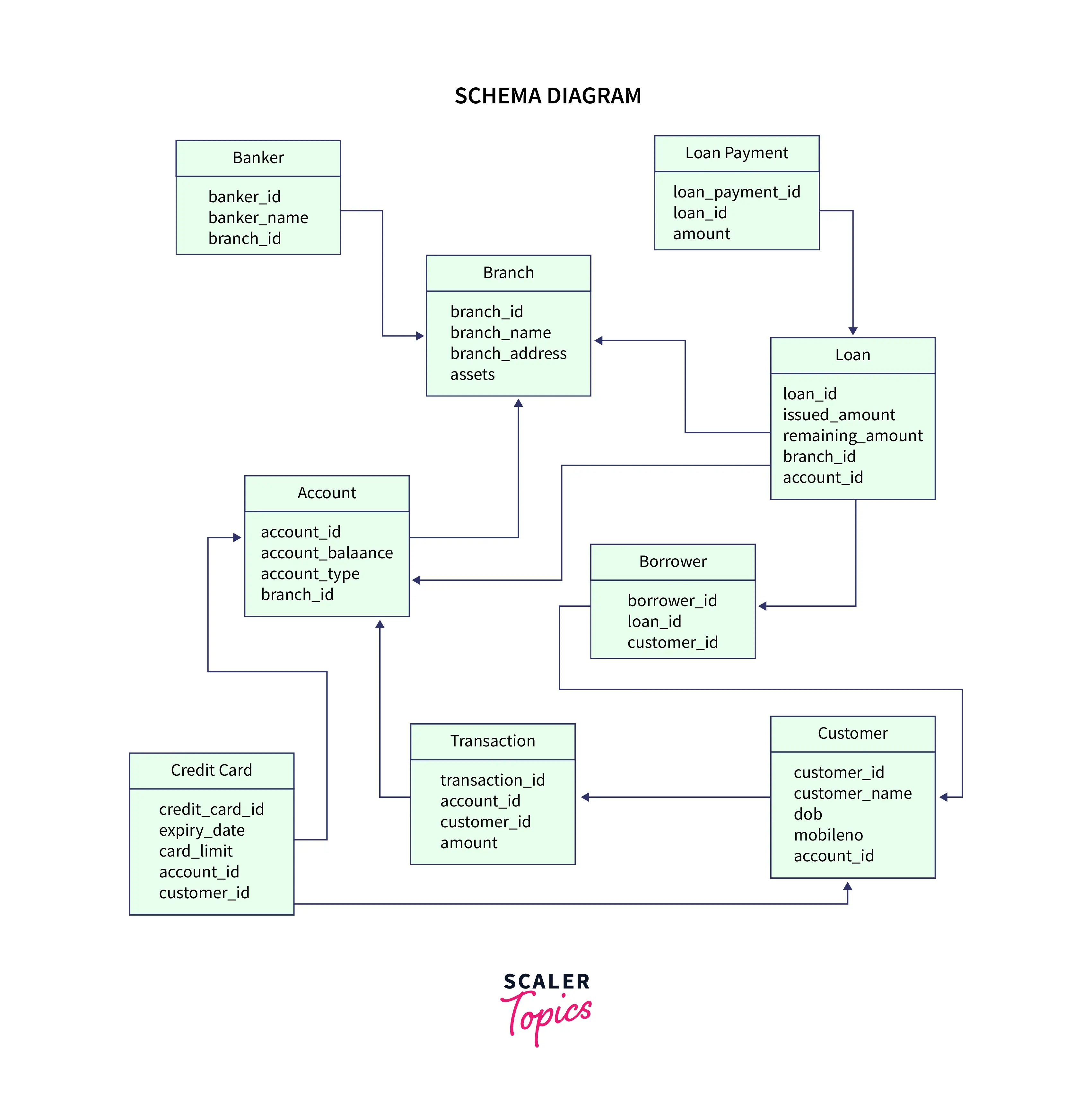 Overall the schema conveys the description of the database. The following schemas will be designed for the banking database, We will perform sql queries for the banking database after visualizing the Schemas; it will help us to understand the system in a better way.