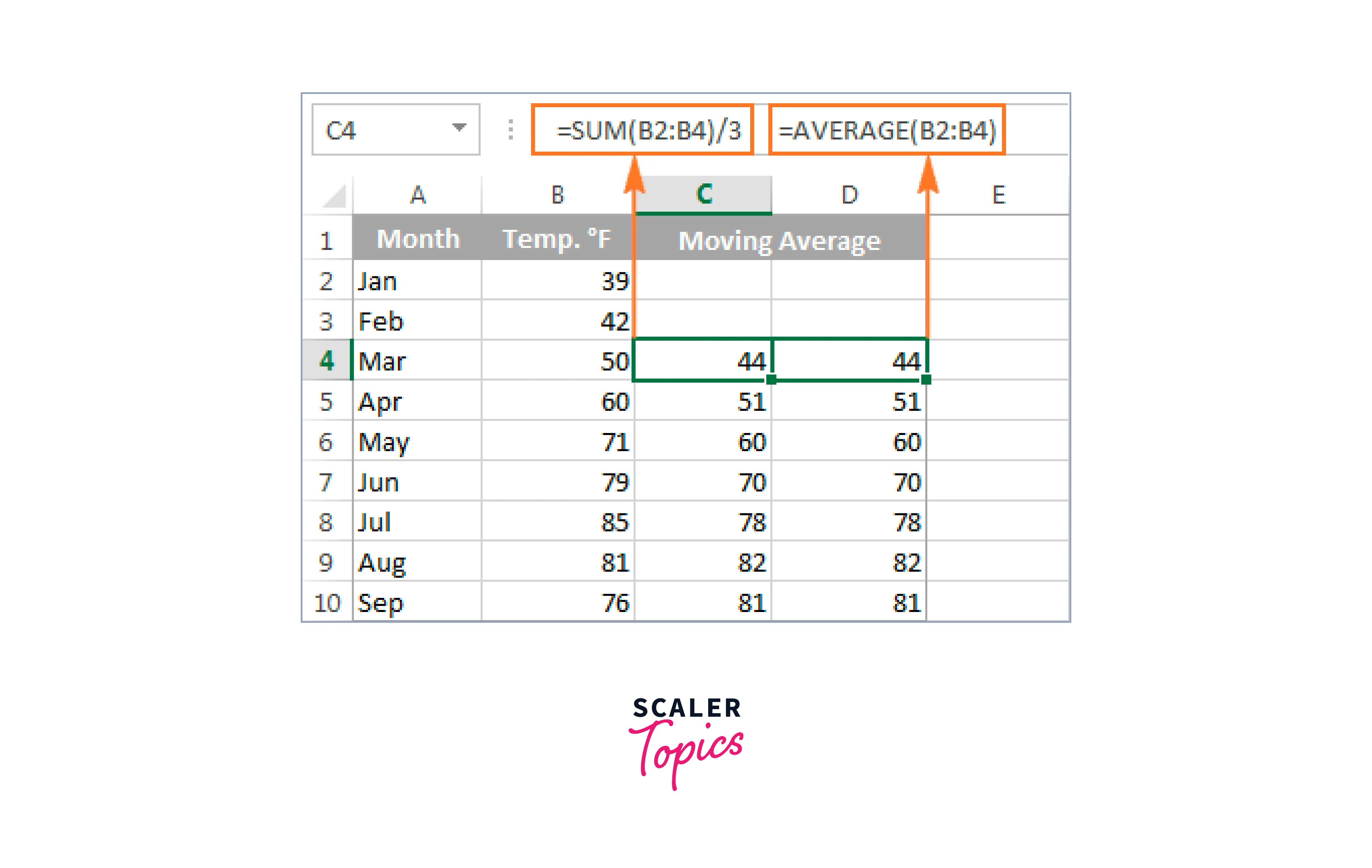 The AVERAGE function makes calculating the simple moving average quick and easy. Let's say you want to get a moving average for three months (as shown in the figure above) for a list of average monthly temperatures in column B.