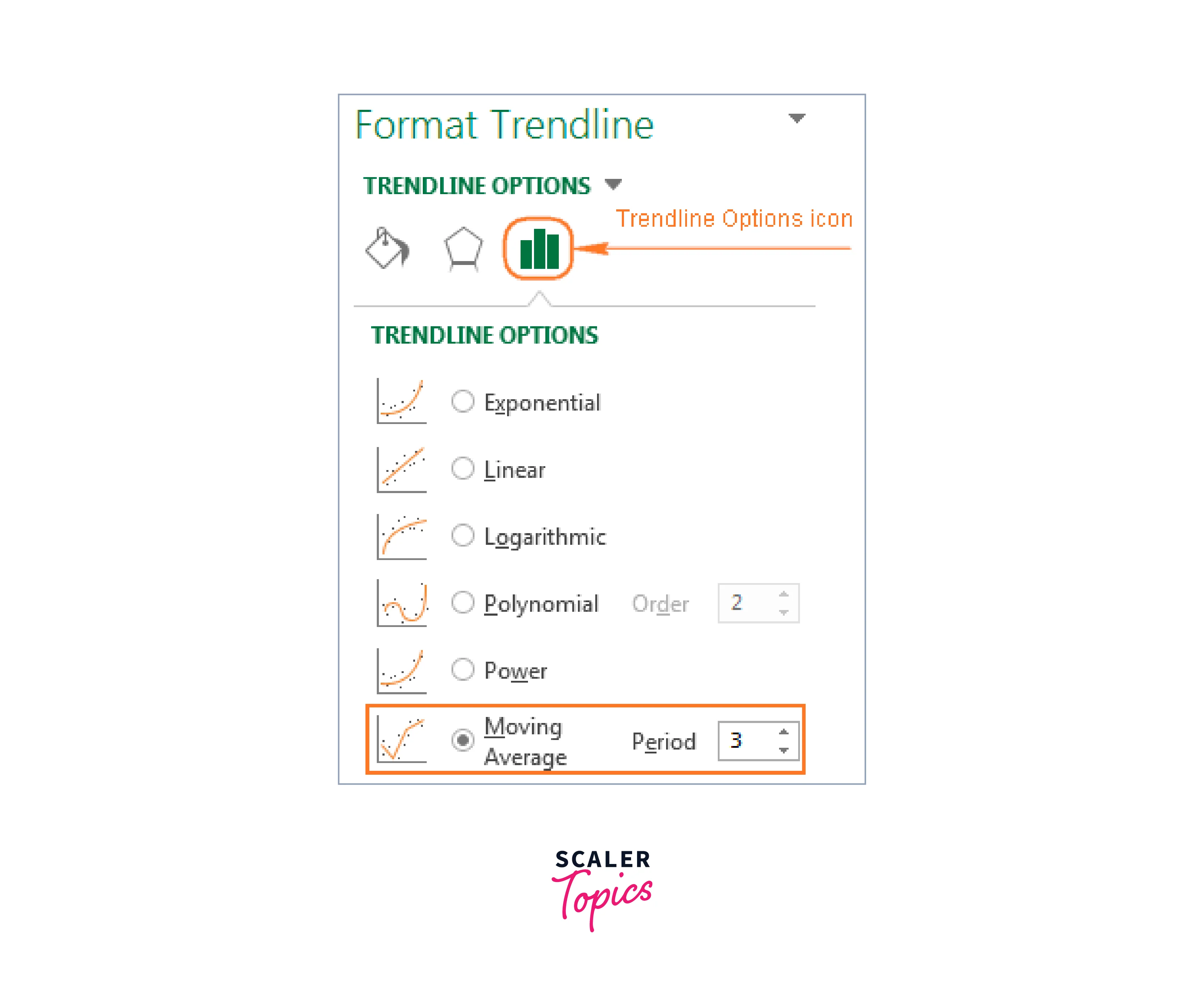 You click the Trendline Options button on the Format Trendline window, choose the Moving Average option, and enter the moving average interval into the Period box: