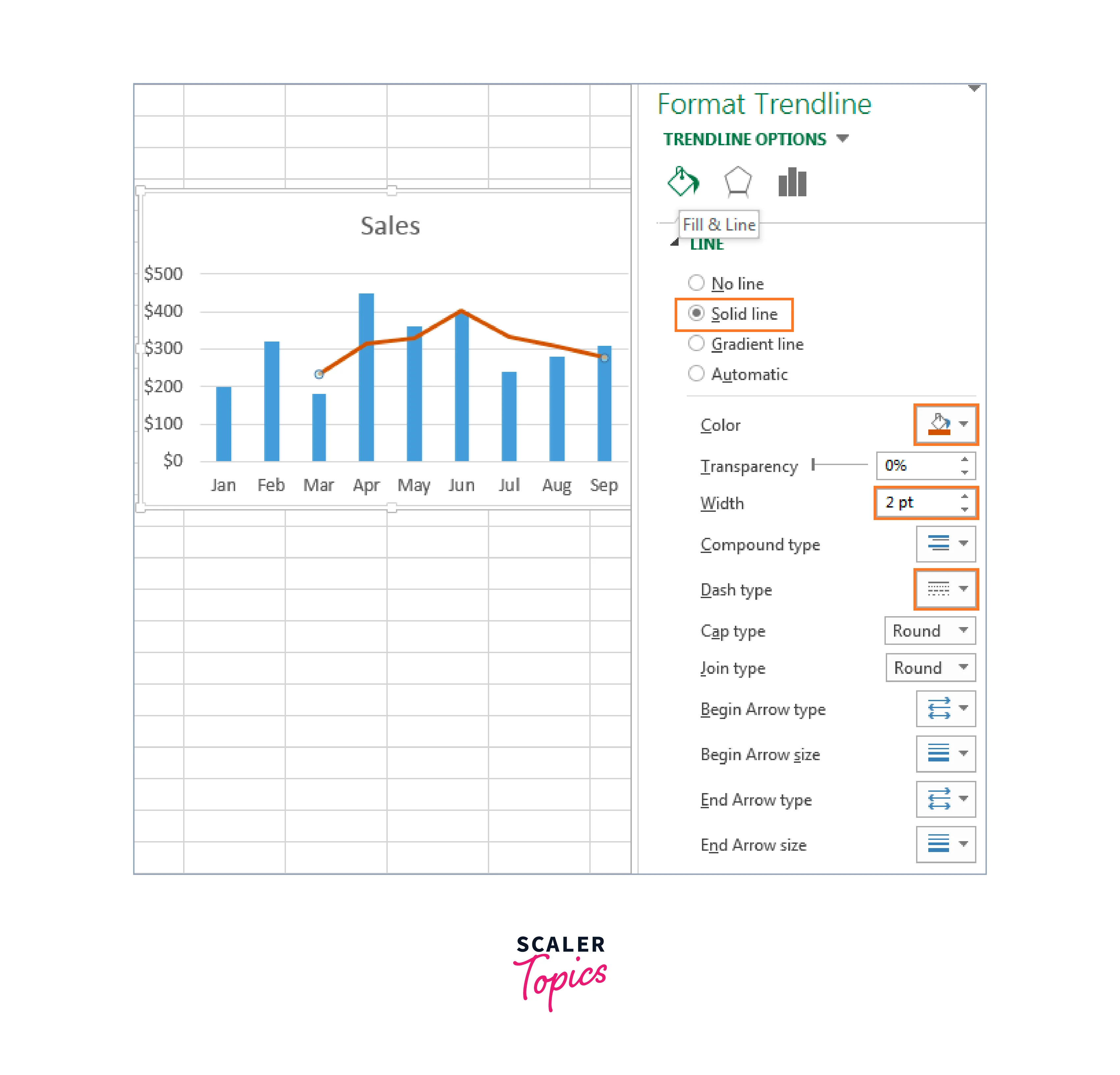 You may play around with different options, including line type, color, and width, by switching to the Fill & Line or Effects tab on the Format Trendline window and refining your chat.
