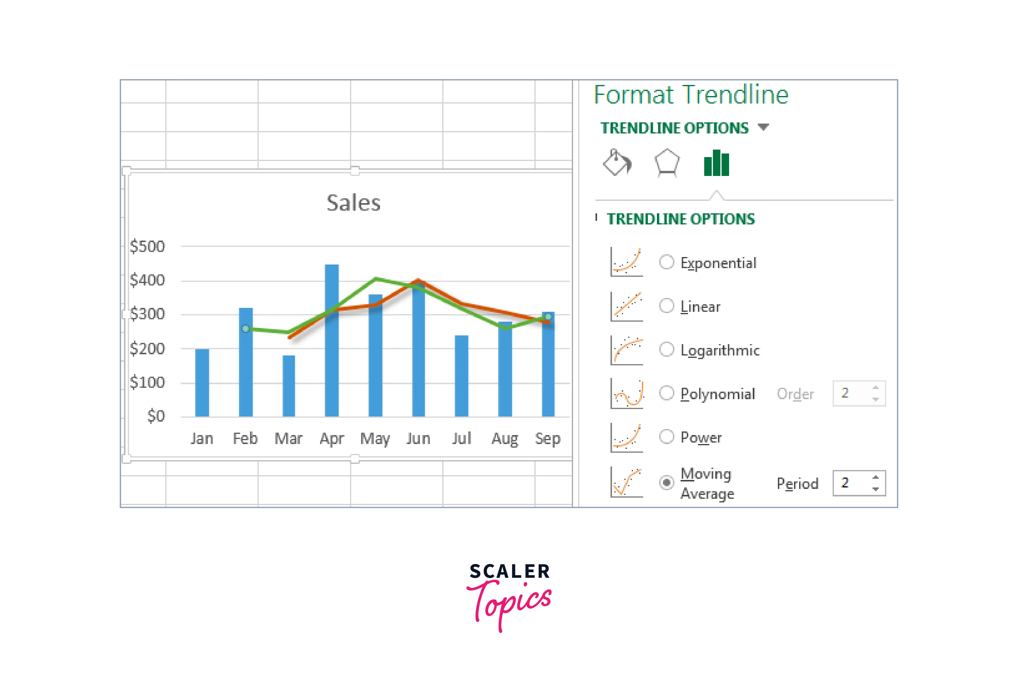 You could wish to add a few moving average trend lines with various time intervals to your data for more effective data analysis to show how the trend changes over time. The 2-month (green) and 3-month (brick red) moving average trend lines are displayed in the following screenshot: