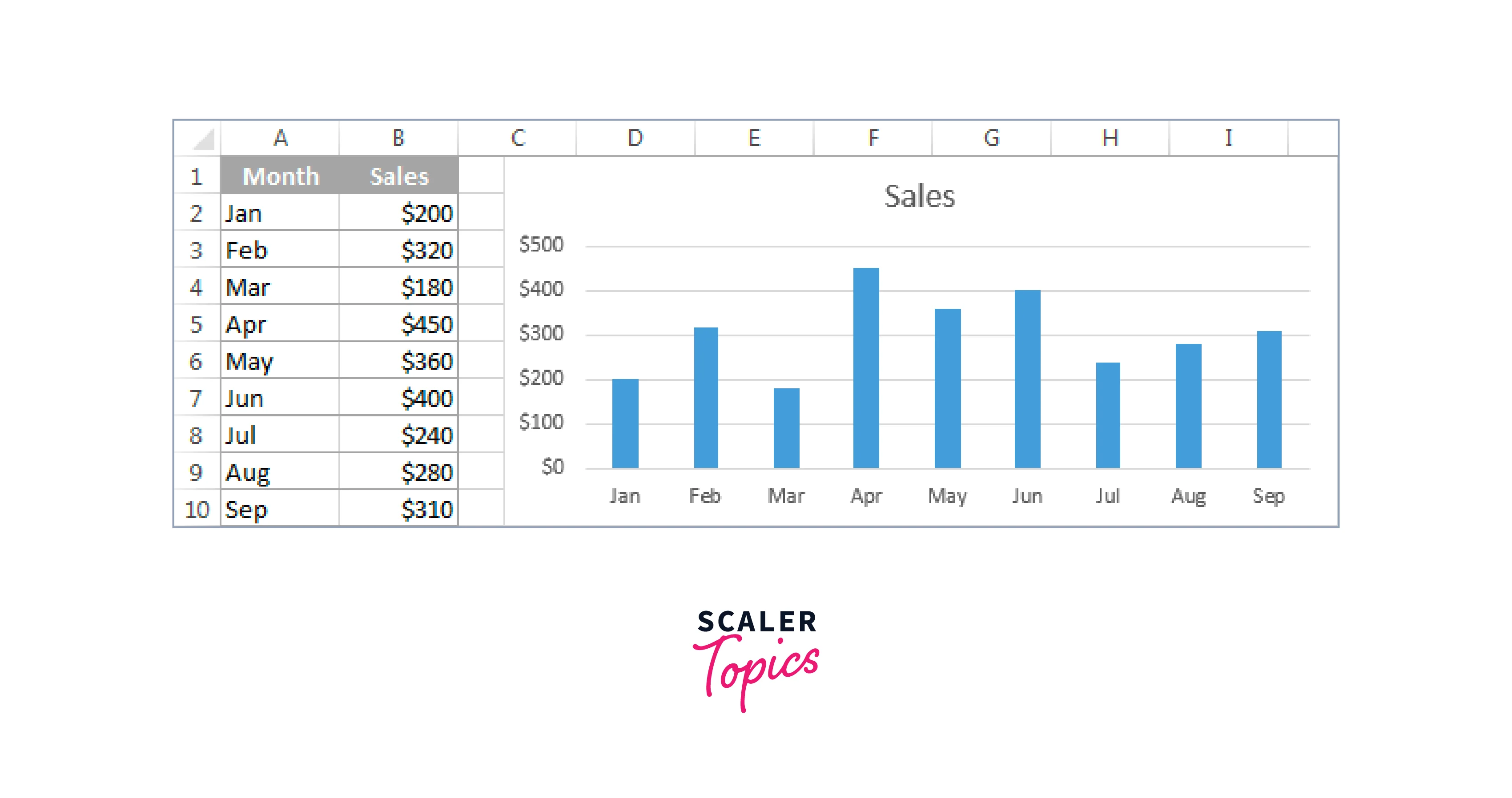 For this example, I've made a 2-D column chart for our sales data using the Insert tab > Charts group: