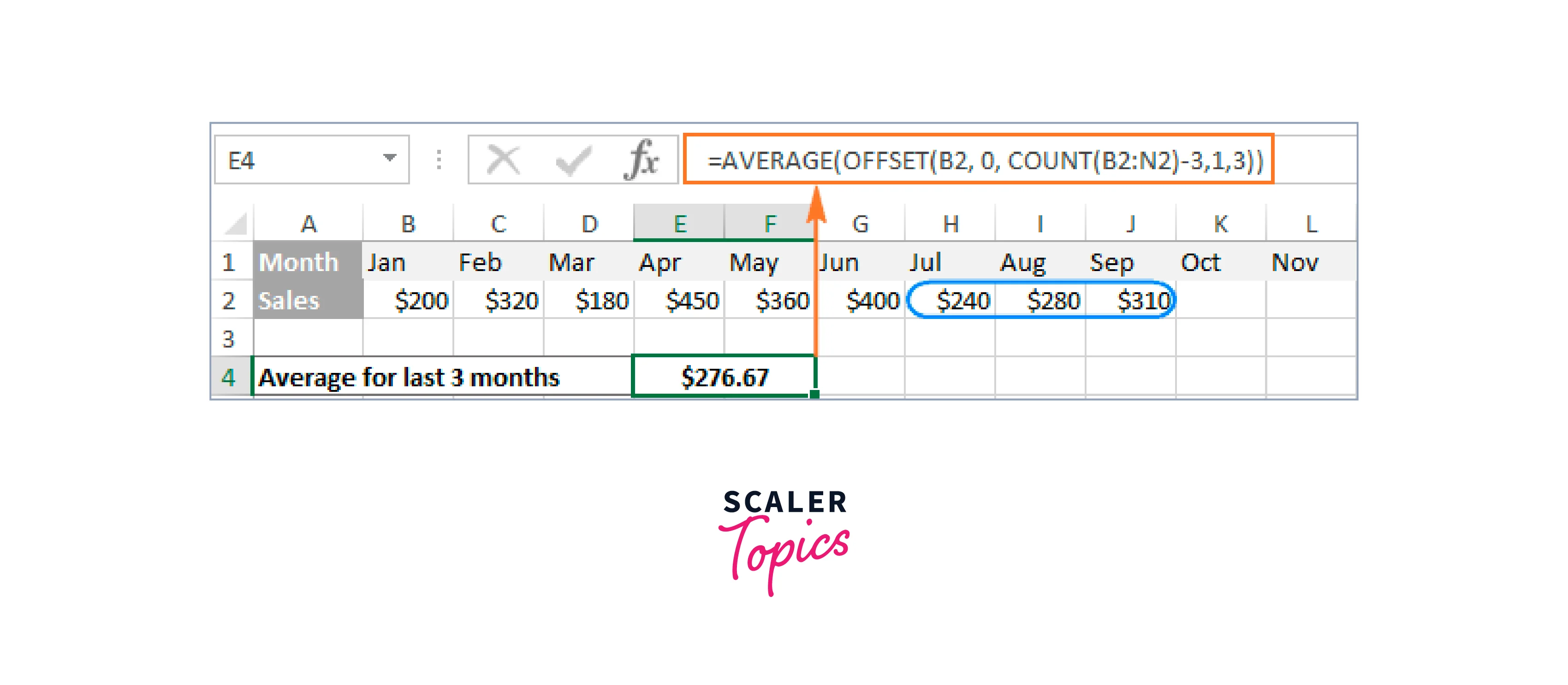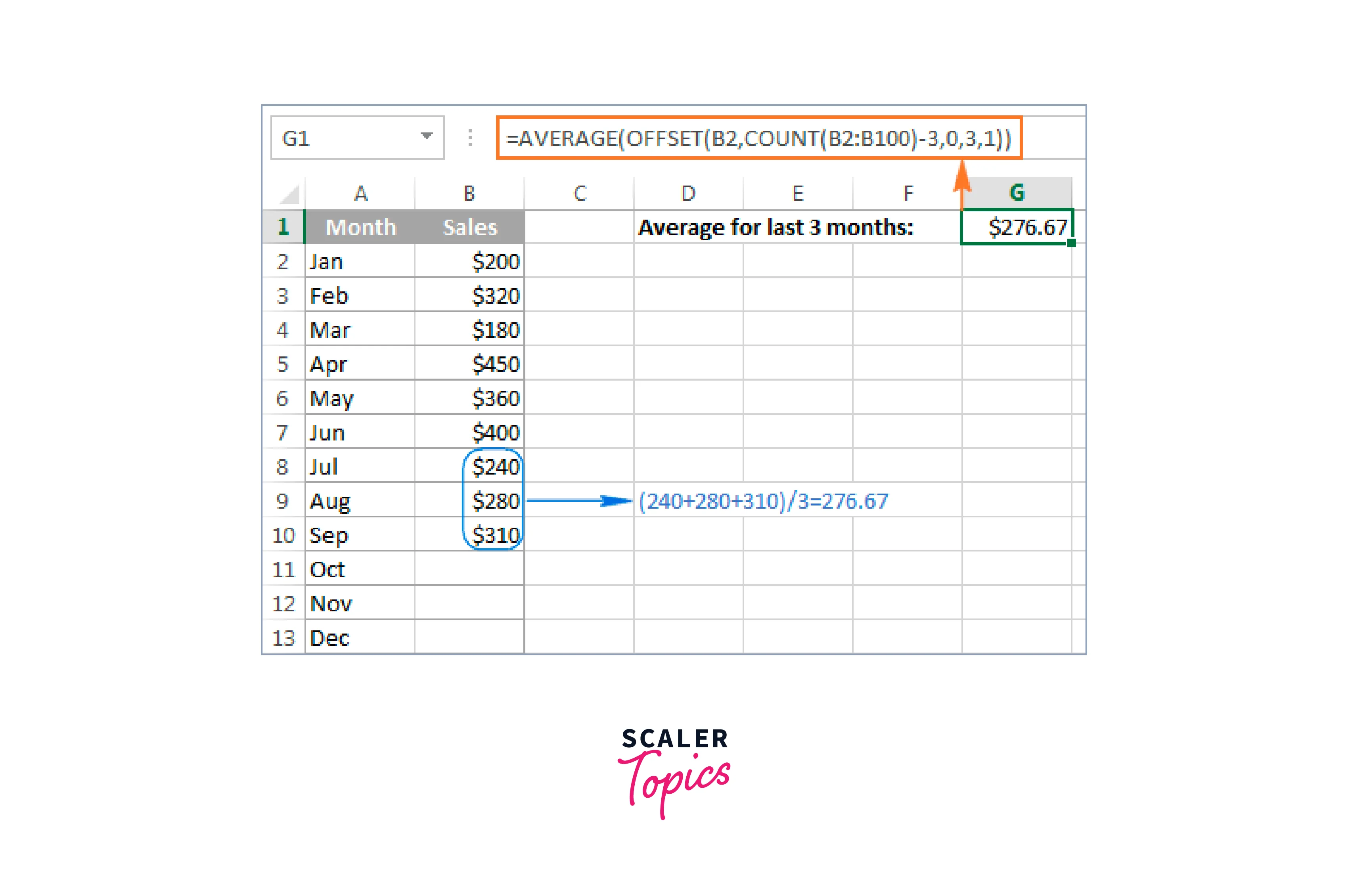 The COUNT function returns a result that is offset by the OFFSET function by shifting the count up to 3 rows (-3 in the second argument) starting at cell B2 (the first argument). As a result, it returns the total values for the most recent three months, which are included in a range with three rows (three in the fourth parameter) and one column (one in the last argument). The returned sum is then used to construct the moving average using the AVERAGE function.