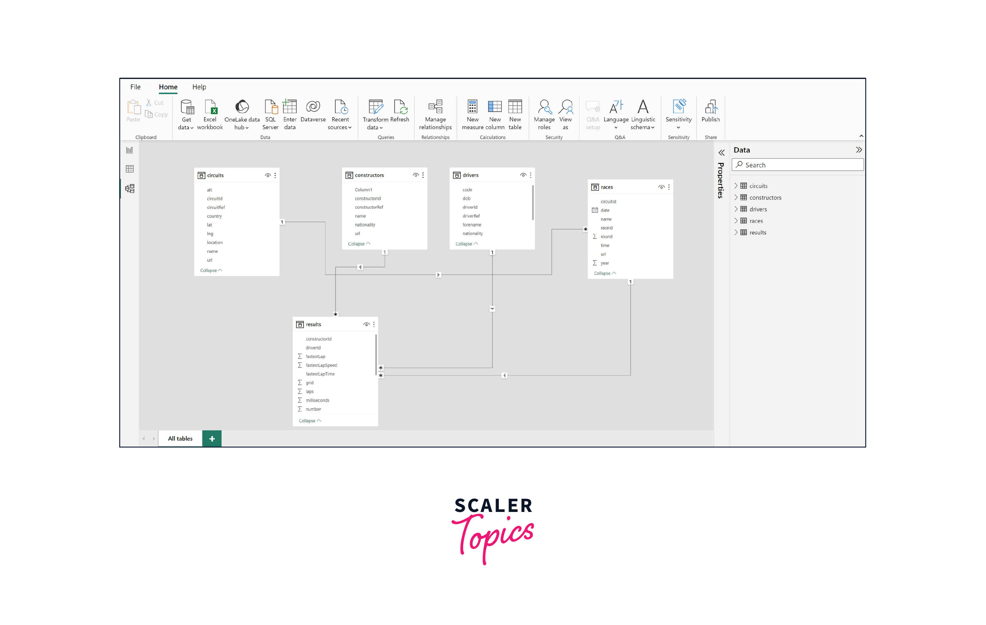 The next step in performing F1 data analysis using Power BI is to connect to your data source. For this project, we will utilize a formula one dataset which can be downloaded from here. This offers a comprehensive compilation of information about drivers, constructors, races, results, and many more. It spans from the 1950 season to 2018, providing a historical view. For our F1 data analysis using Power BI, I have imported five key tables - circuits, constructors, drivers, races, and results.