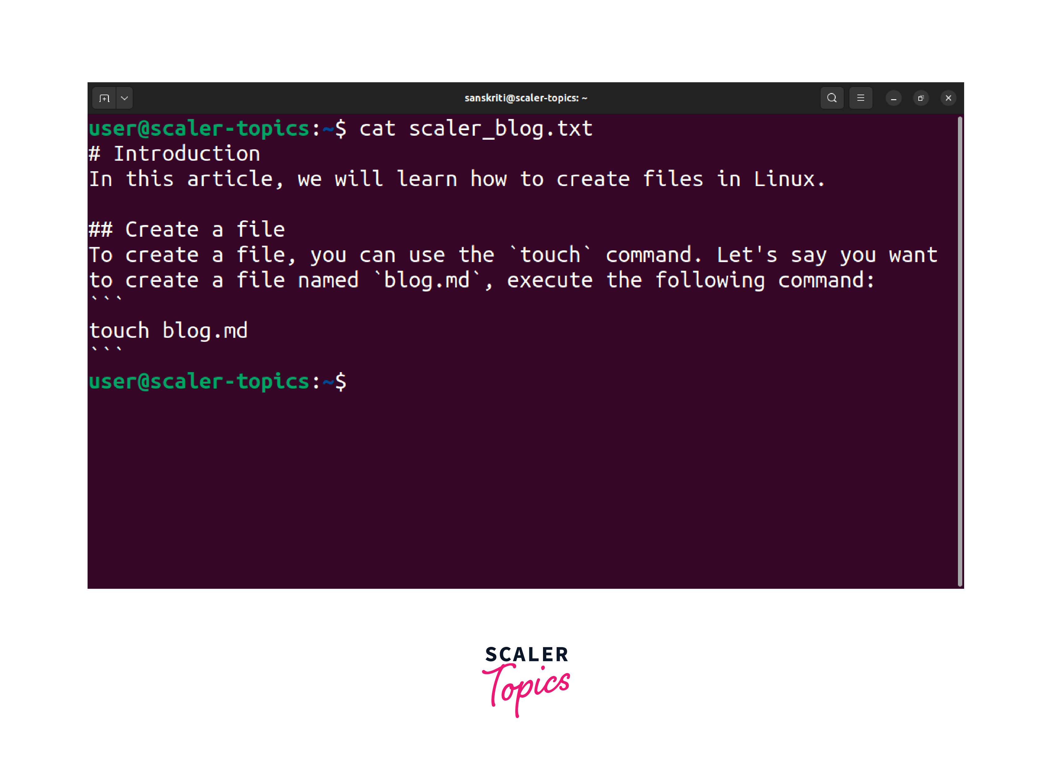 For example, to display the contents of a file named scaler_blog.txt, execute the following: