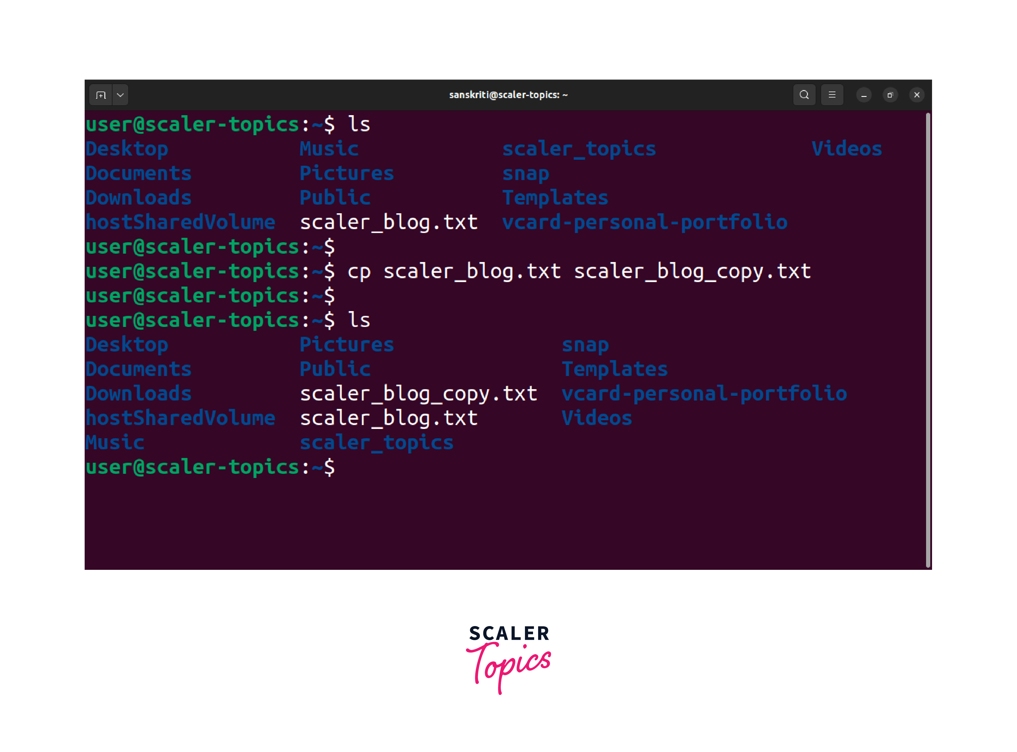 In this example, the cp command creates a new file named scaler_blog_copy.txt that contains the same content as the original scaler_blog.txt. The copy is in the same directory, but you can specify a different destination directory to copy the file to a different location.