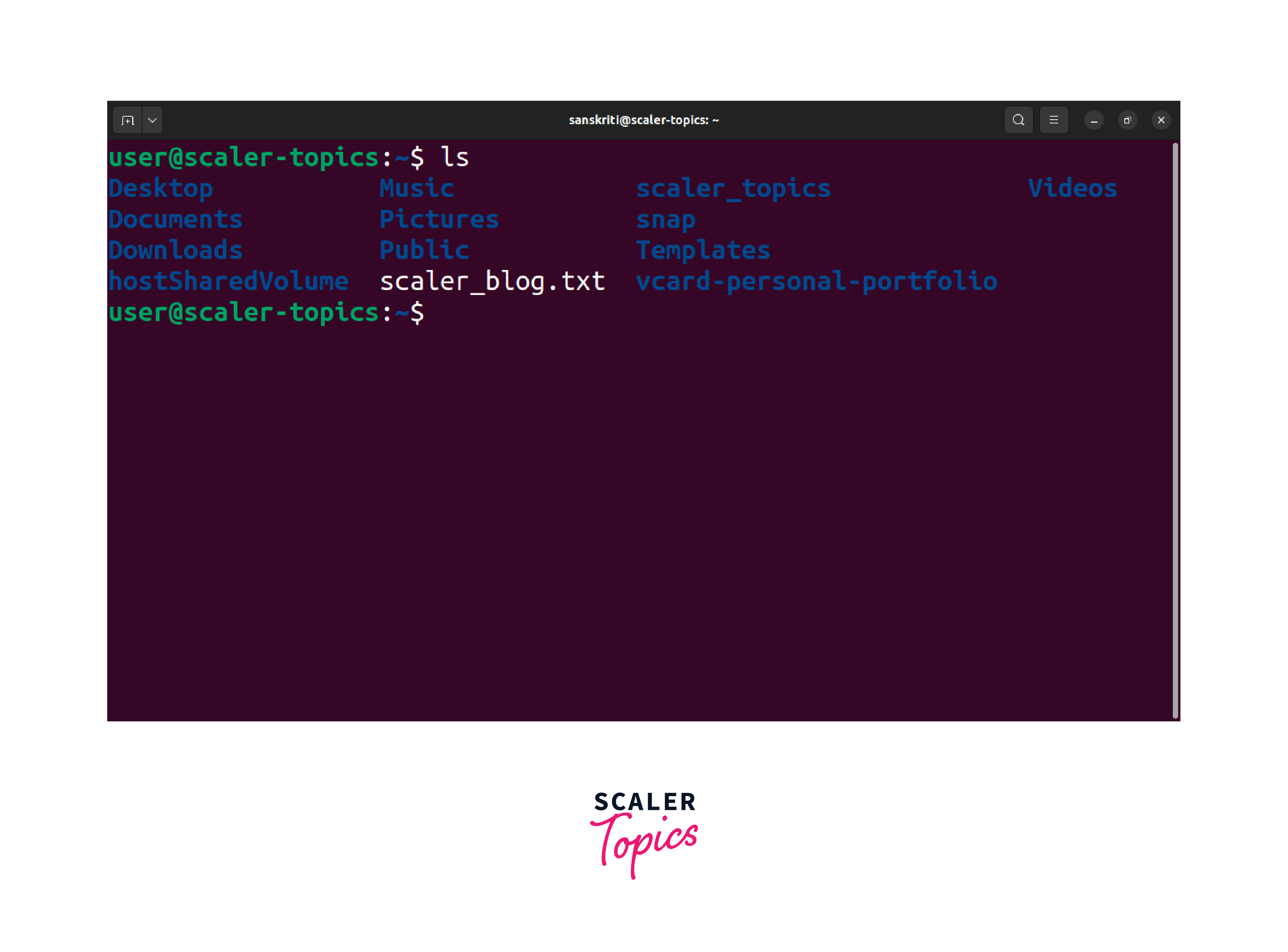 This command will provide an output that includes the names of all the files and directories in the current location, including scaler_blog.txt if it exists. The ls command offers various options to customize the output, such as displaying file details, sorting by different criteria, and filtering specific file types. It is a fundamental command for inspecting and navigating the file system. It is one of the popular commands for file management in Linux.
