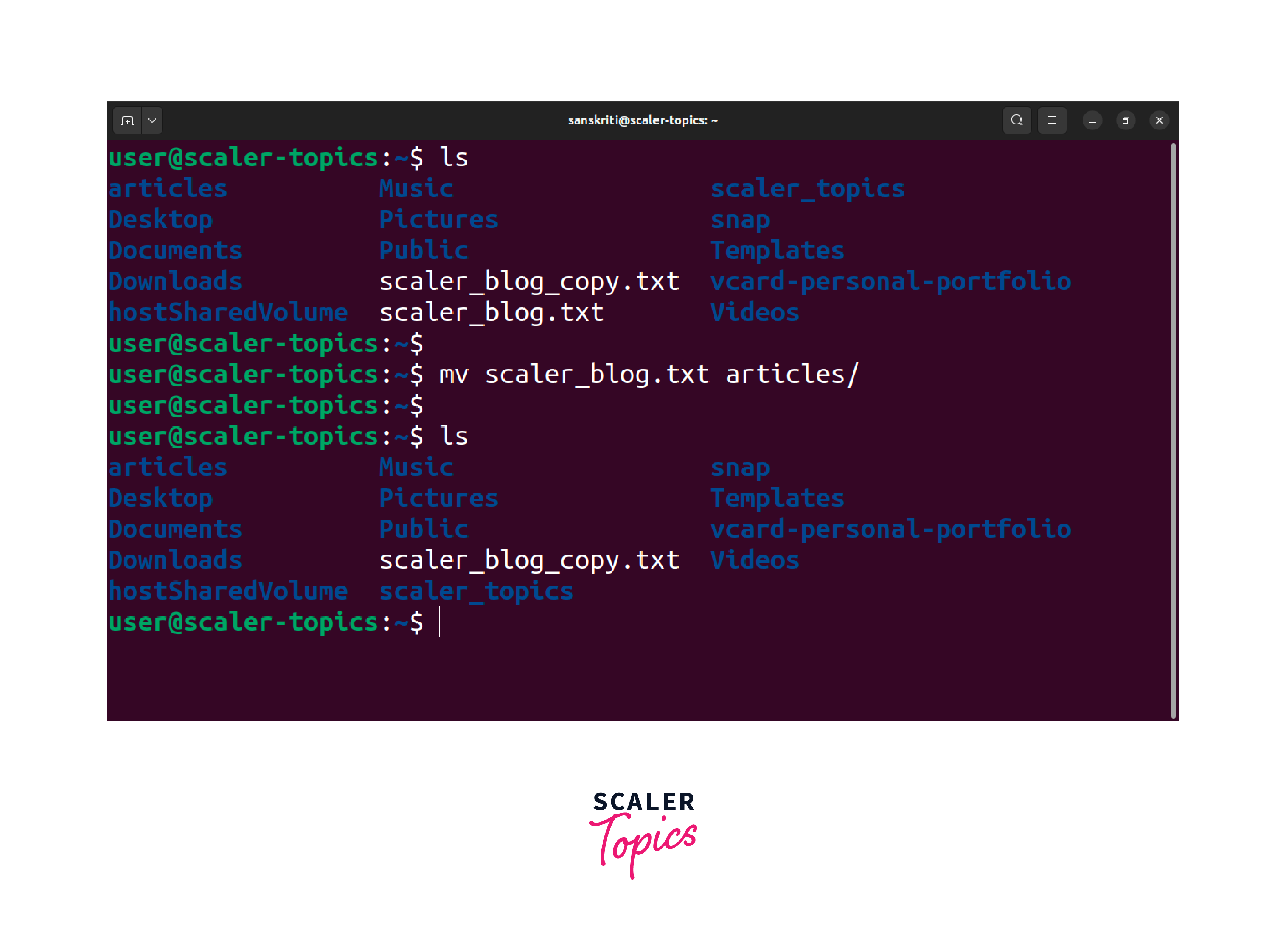 In this example, the file scaler_blog.txt id moved from the current directory to the articles directory.