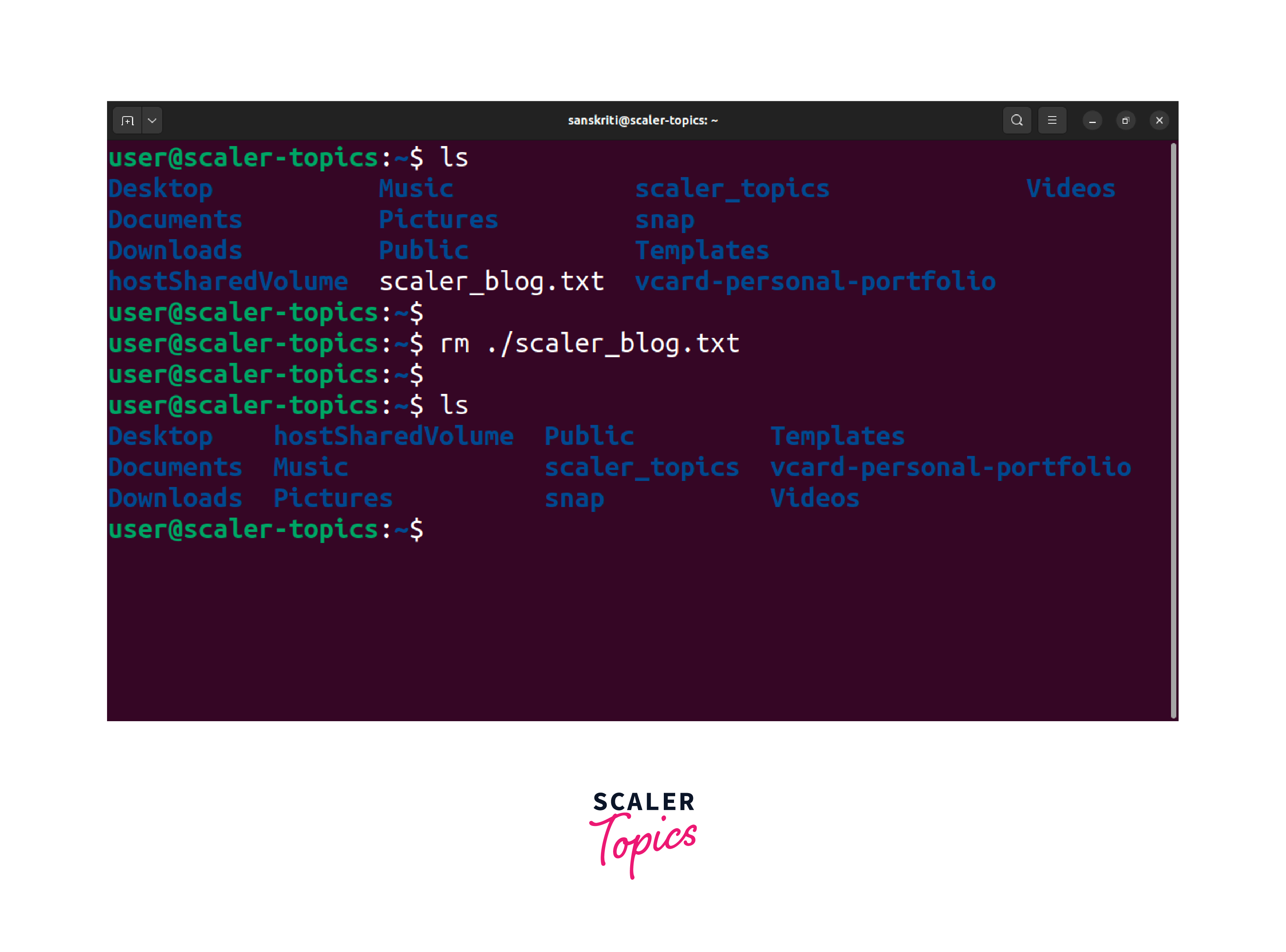 Here, <file_path> represents the path to the file you want to delete. It can be an absolute path, such as /home/user/scaler_blogs.txt, or a relative path, such as ./scaler_blog.txt.