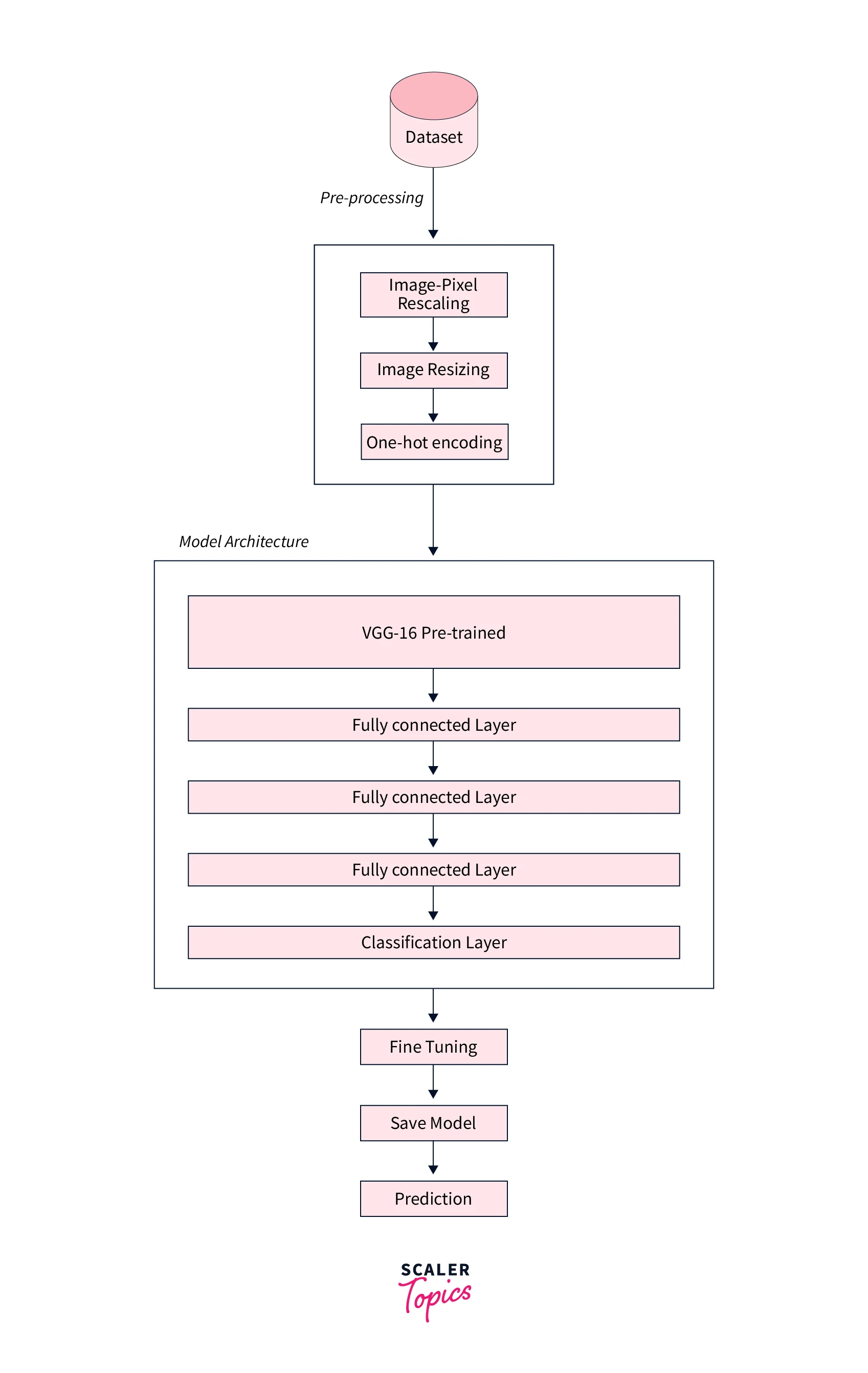 - Model Architecture: In this section, we will use VGG-16 pre-trained layer with a custom dense layer and a complete classification layer according to our Dataset.