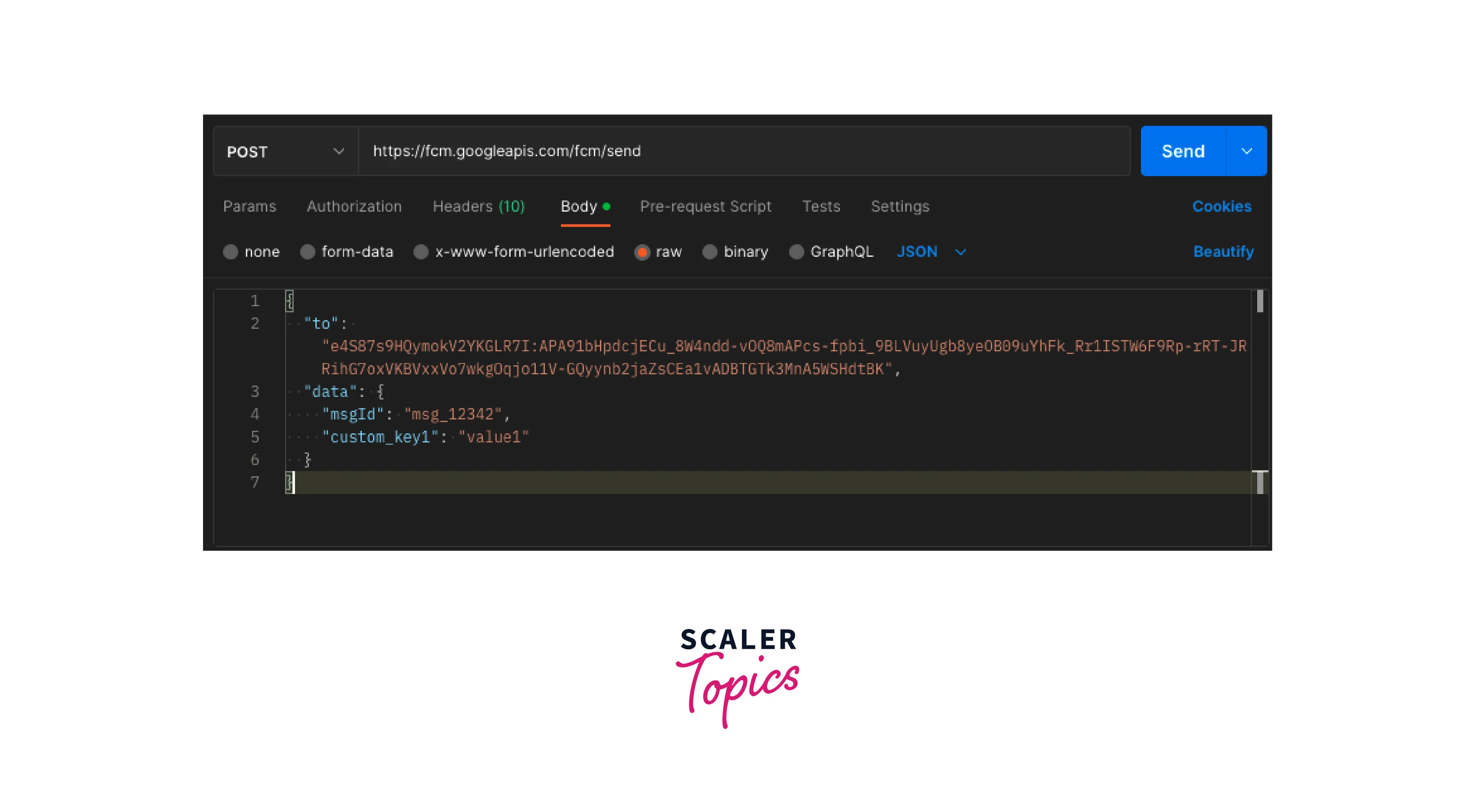 Data Messages For data messages, which only contain user-defined custom keys and values, you can send the message using Postman to try it out. You will need a server key from Firebase Console and then you can send the message like this: