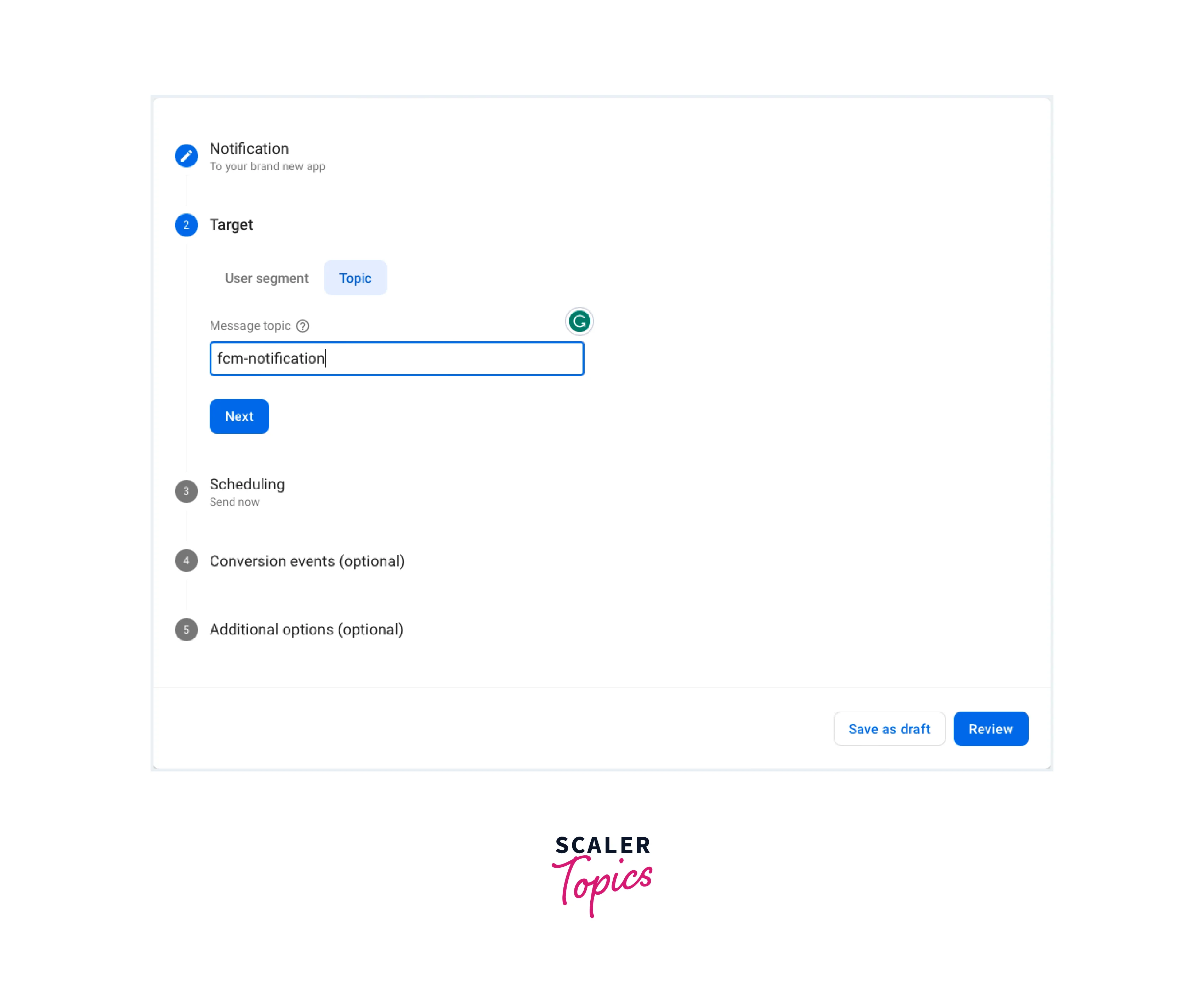 - You start by creating a message with all the details using a Notification Composer which is a User Interface that helps in composing messages. There is also an option of creating your server which supports Firebase Admin SDK or` FCM server protocols. Using your server helps you with complete automation. But the Notification Composer provided by Firebase is enough for sending out notification messages.