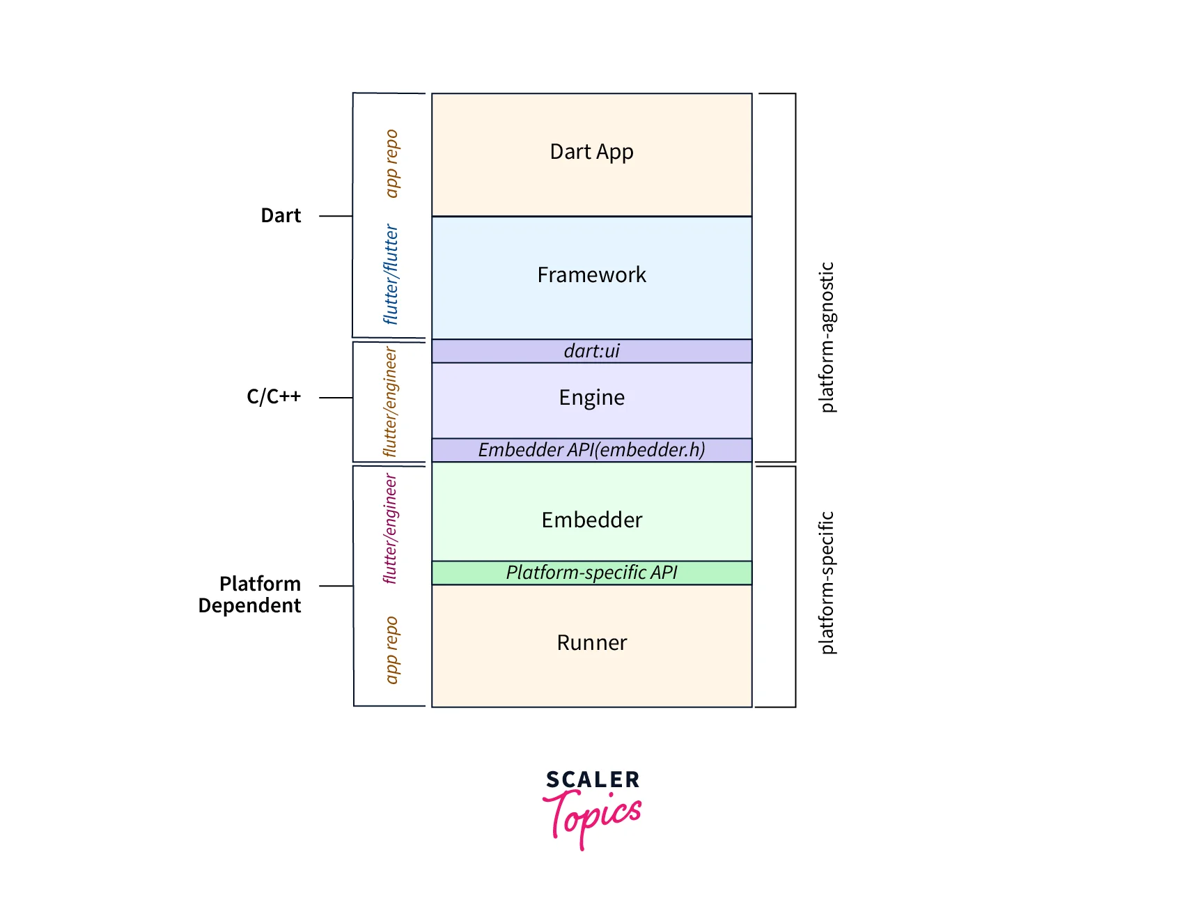 The embedder layer handles platform-specific tasks such as input handling, rendering, and event loops. It provides the necessary APIs for communication between the platform-specific code and the Flutter framework. Additionally, the embedder layer supports embedding Flutter within other platforms and applications, enabling developers to use Flutter as a UI toolkit for their existing projects. For example, Flutter can be embedded within a native Android or iOS app or a web page using Flutter for the Web.