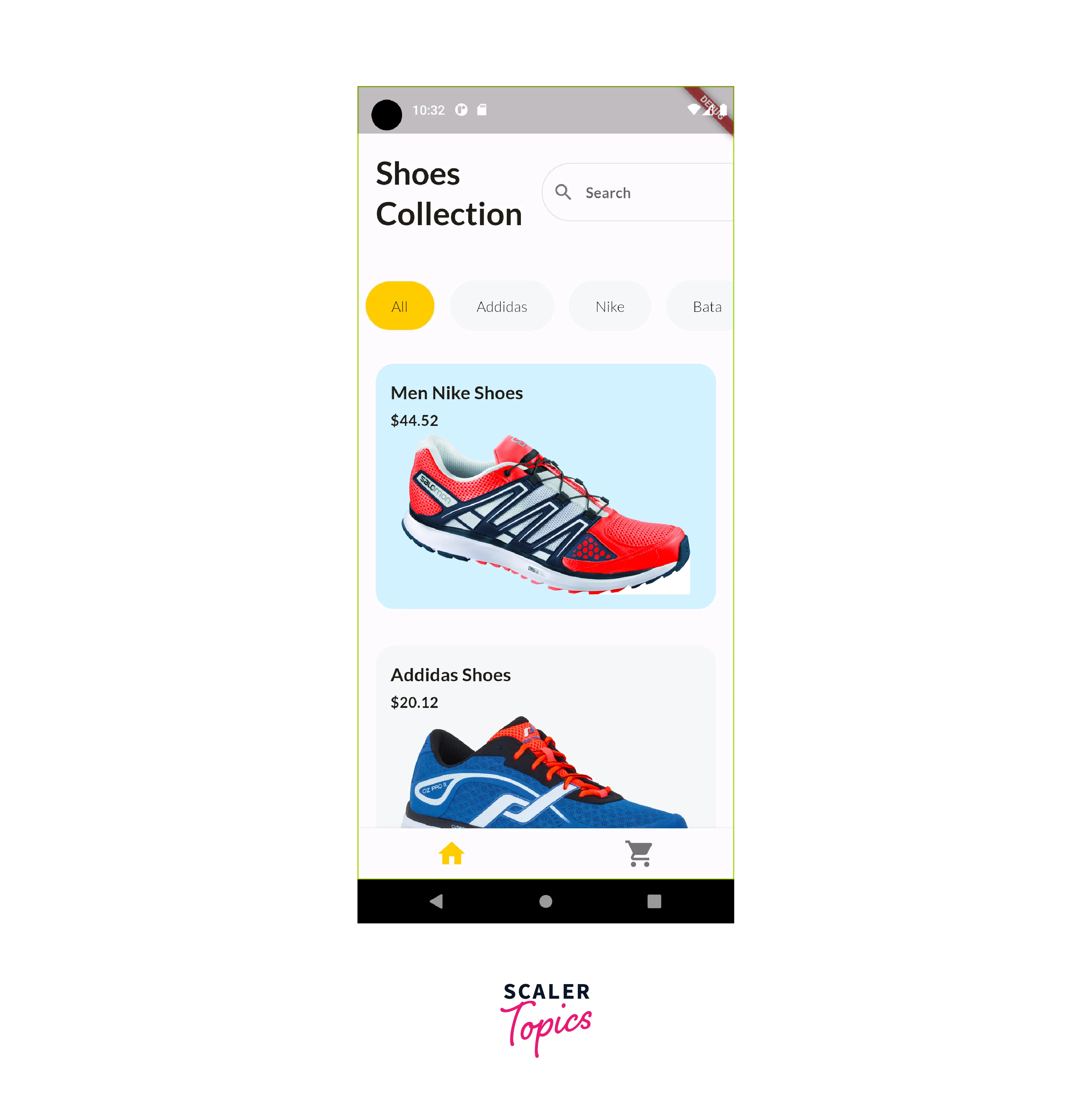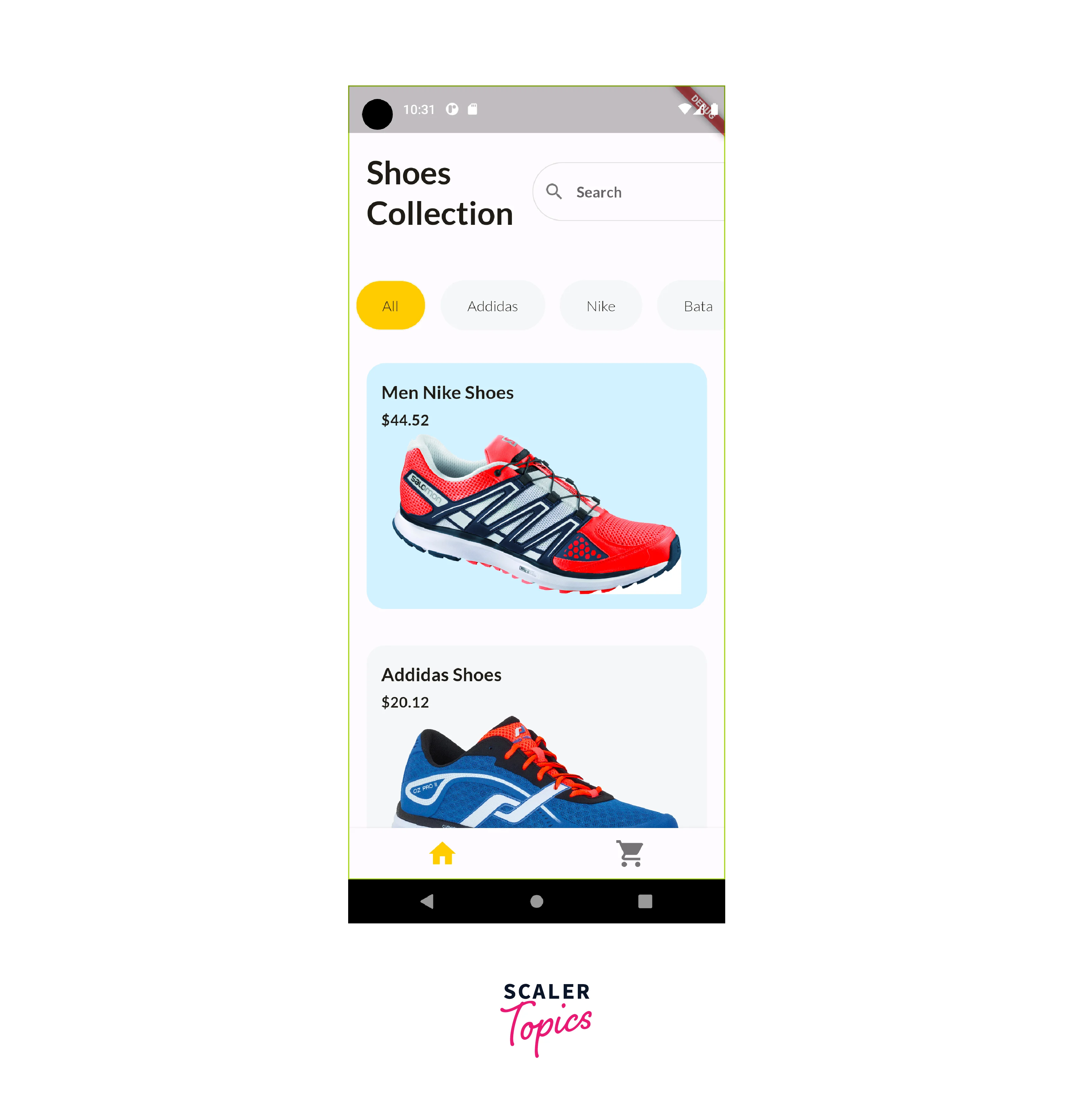 App Bar: The top of the home screen typically contains an app bar, which displays the name or logo of your e-commerce app. It's a consistent element across your app's screens, providing users with a way to navigate back to the home screen from anywhere in the app.