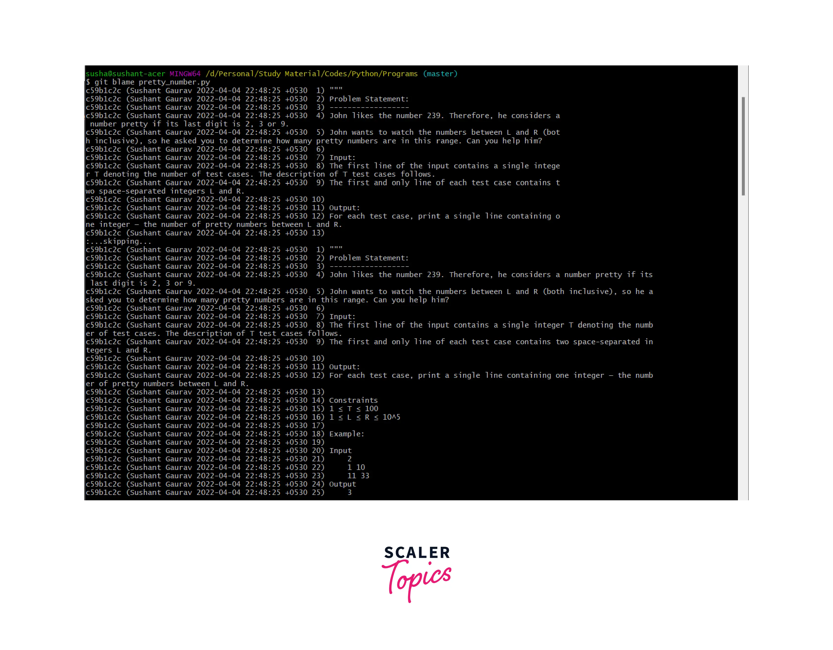 - -C: We use the -C option or flag to detect the copied or moved files from different files. Similar to the last flag, this command will not report to us the name of the last committed author but it will report to us the name of the original author whose files were moved or copied.