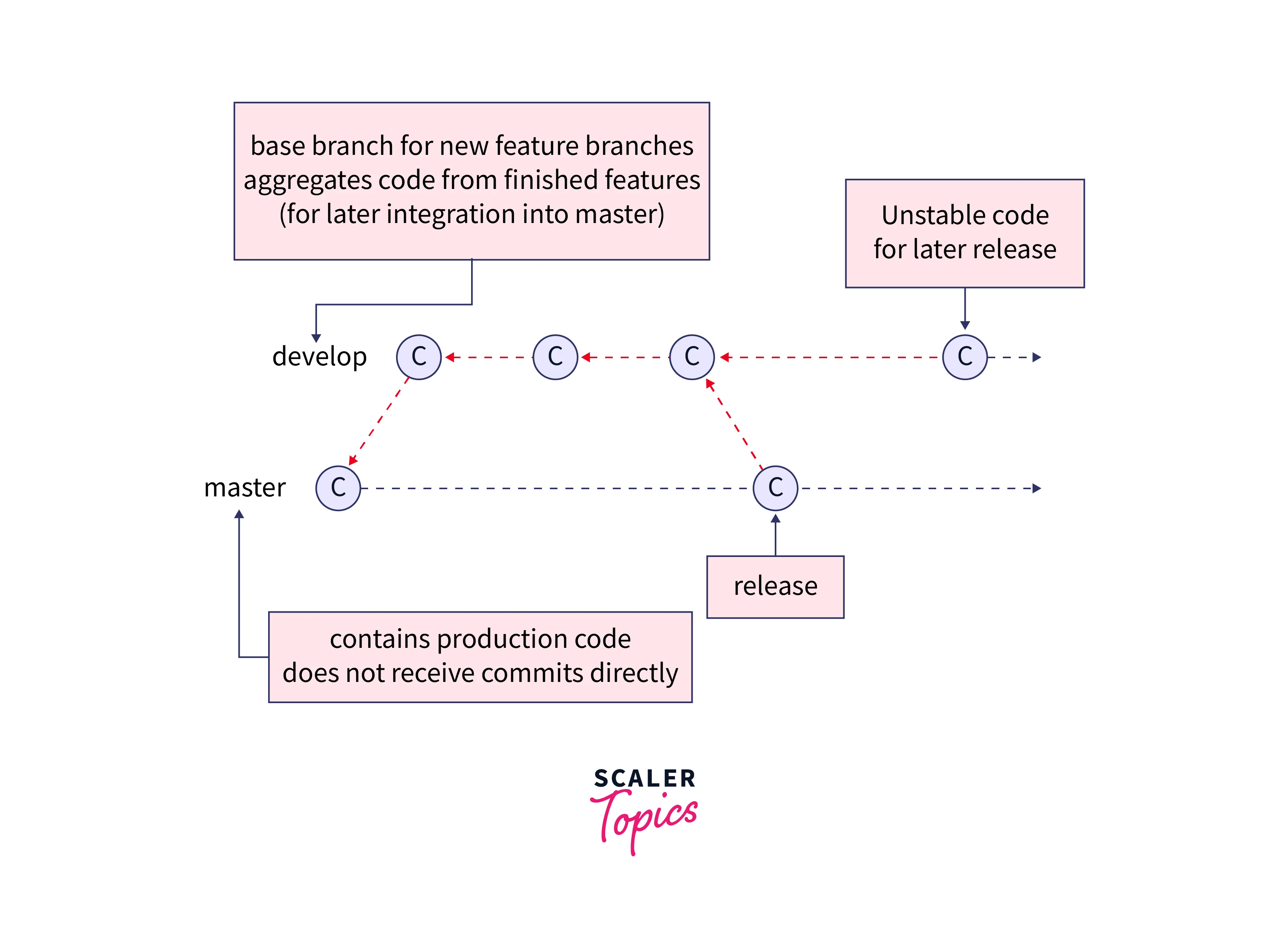 Another development branch should also be created and whenever we start working on a new feature then we must create a feature branch from it. After integrating the changes, we can push it to the development branch. And after testing the latest feature or the bug fixing on the develop branch, we can ultimately push the changes to the main production branch.