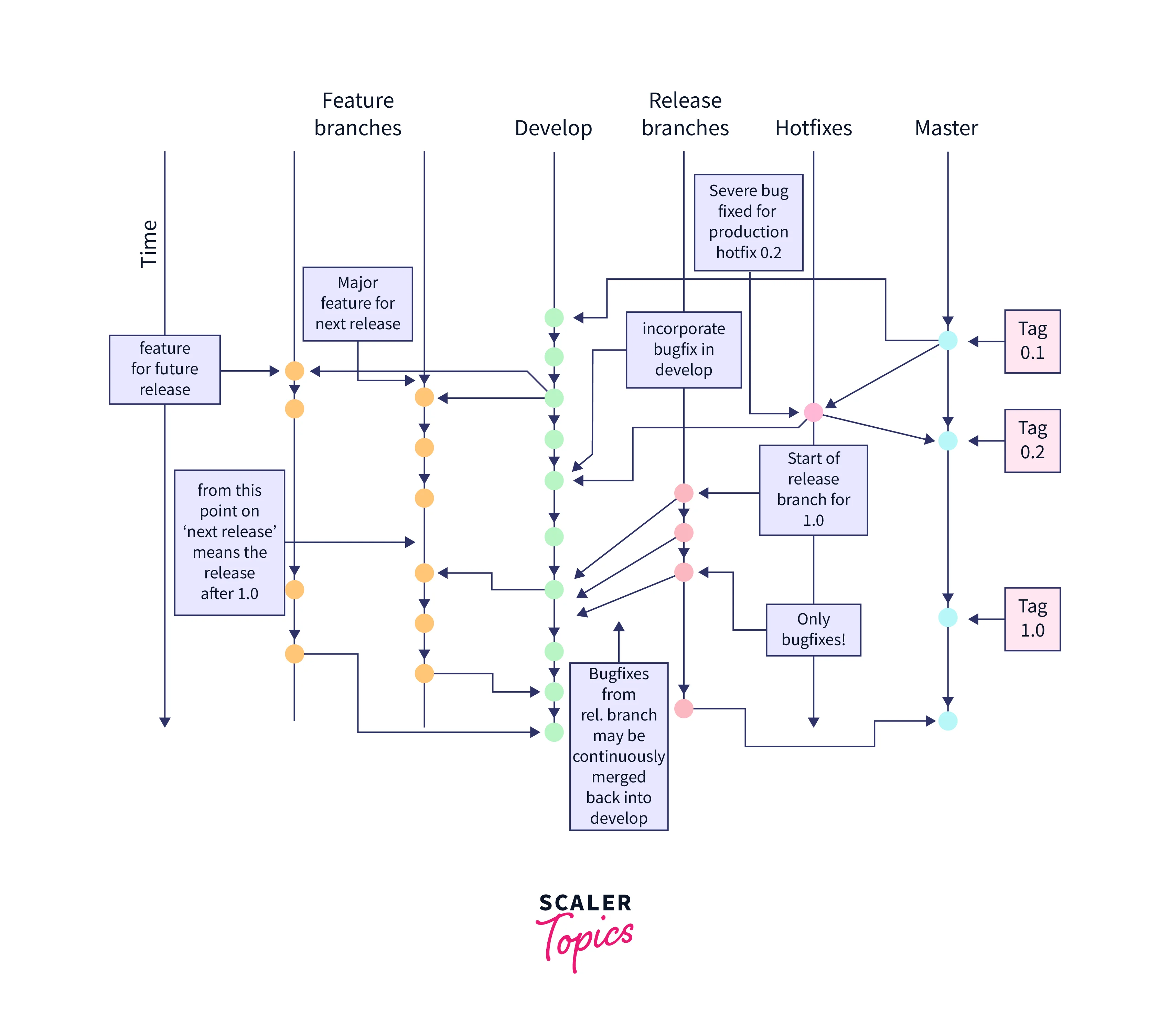 Git flow can be visualized as a set of rules or guidelines that the developers follow during project development in Git. Some developers also term the Git flow as a branching model since the developers create branches, perform their work, and then push those branches to the central branch. Refer to the image provided below for more clarity.