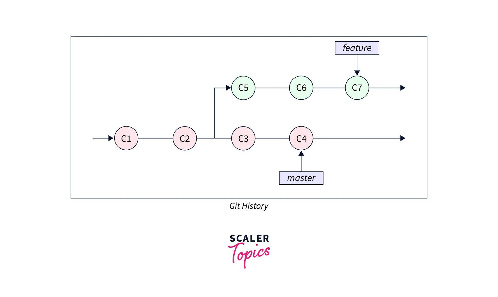In the picture above, we have two branches, master and feature. We can see that we made some code commits in both the feature and the master branches and then we merged them together. The functionality of merging works by iterating over both the branches as a pointer and the pointer will stop when it will find a common base commit between two different branches. Git creates a new merge commit as soon as it finds a common base commit and combines the changes for each merge commit sequence in the queue.