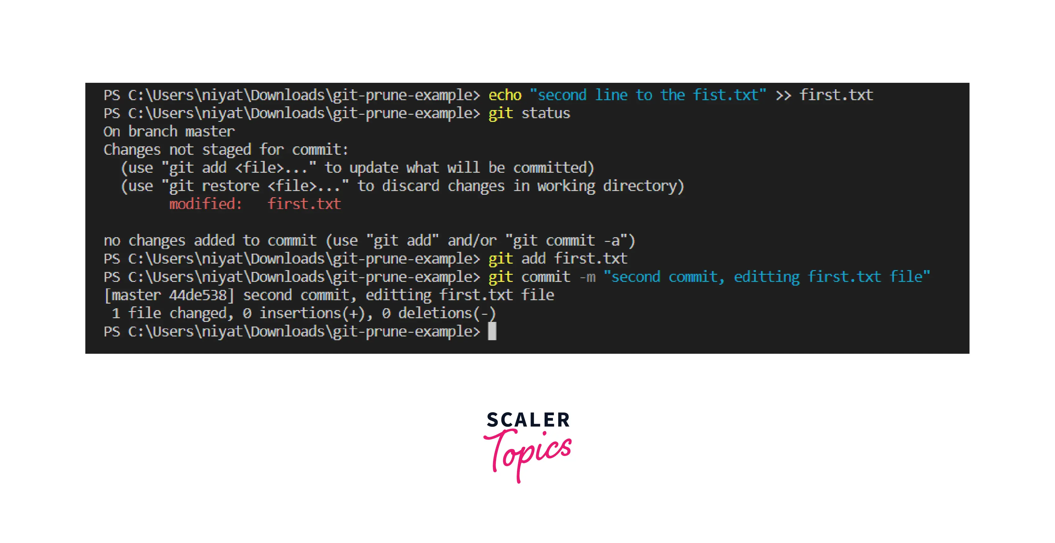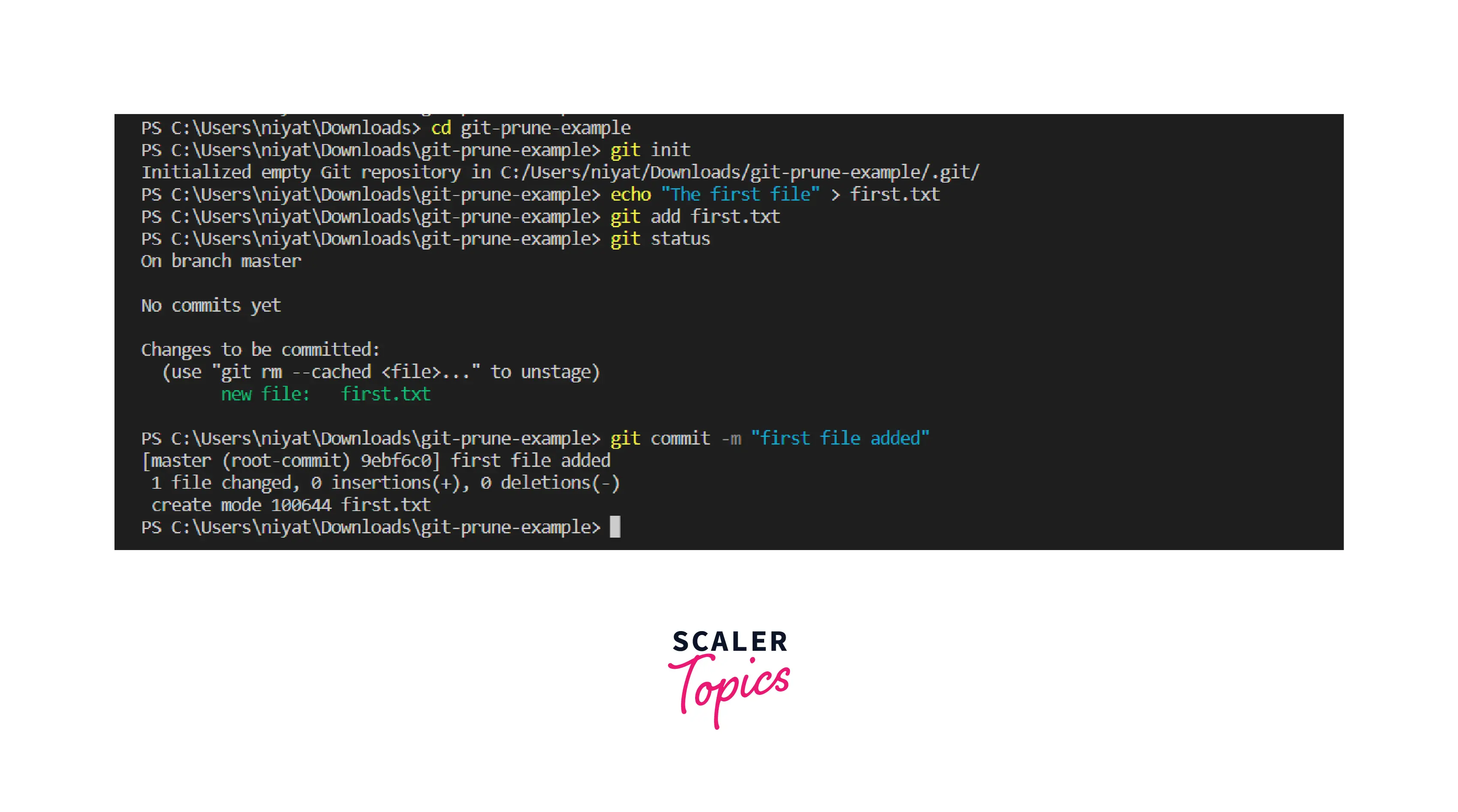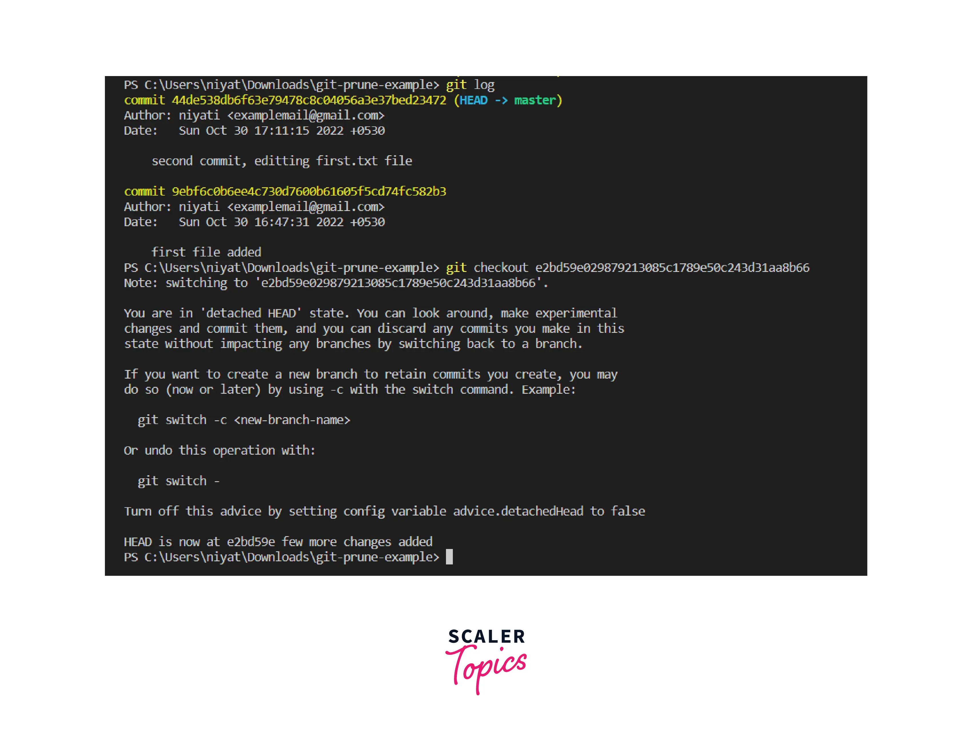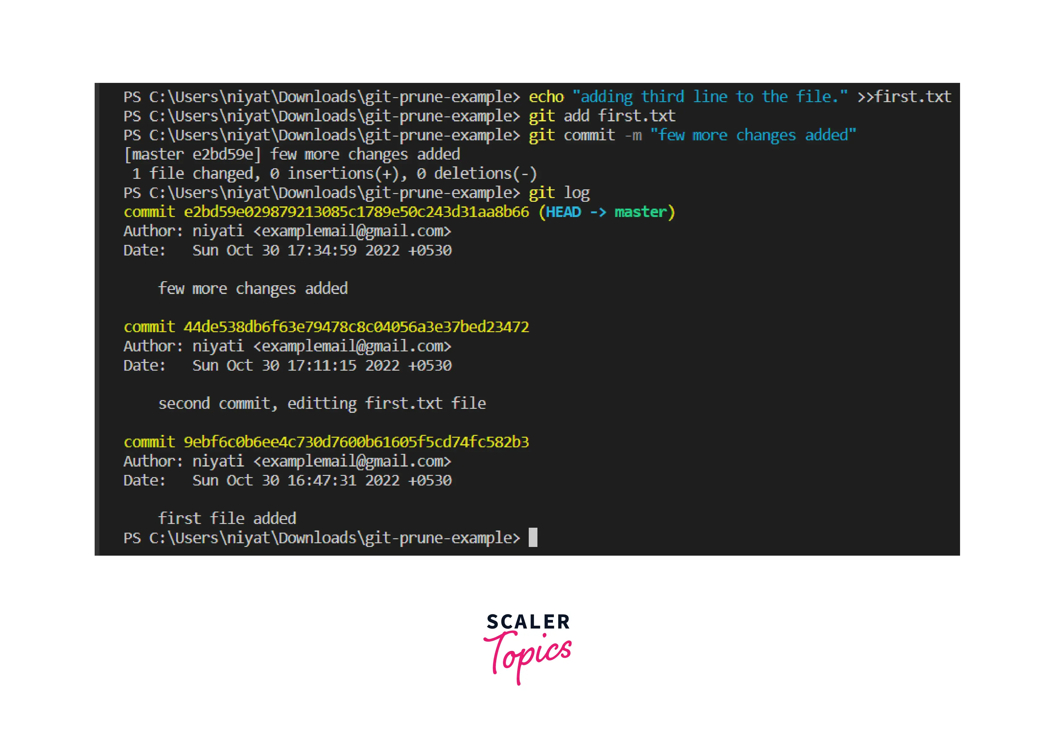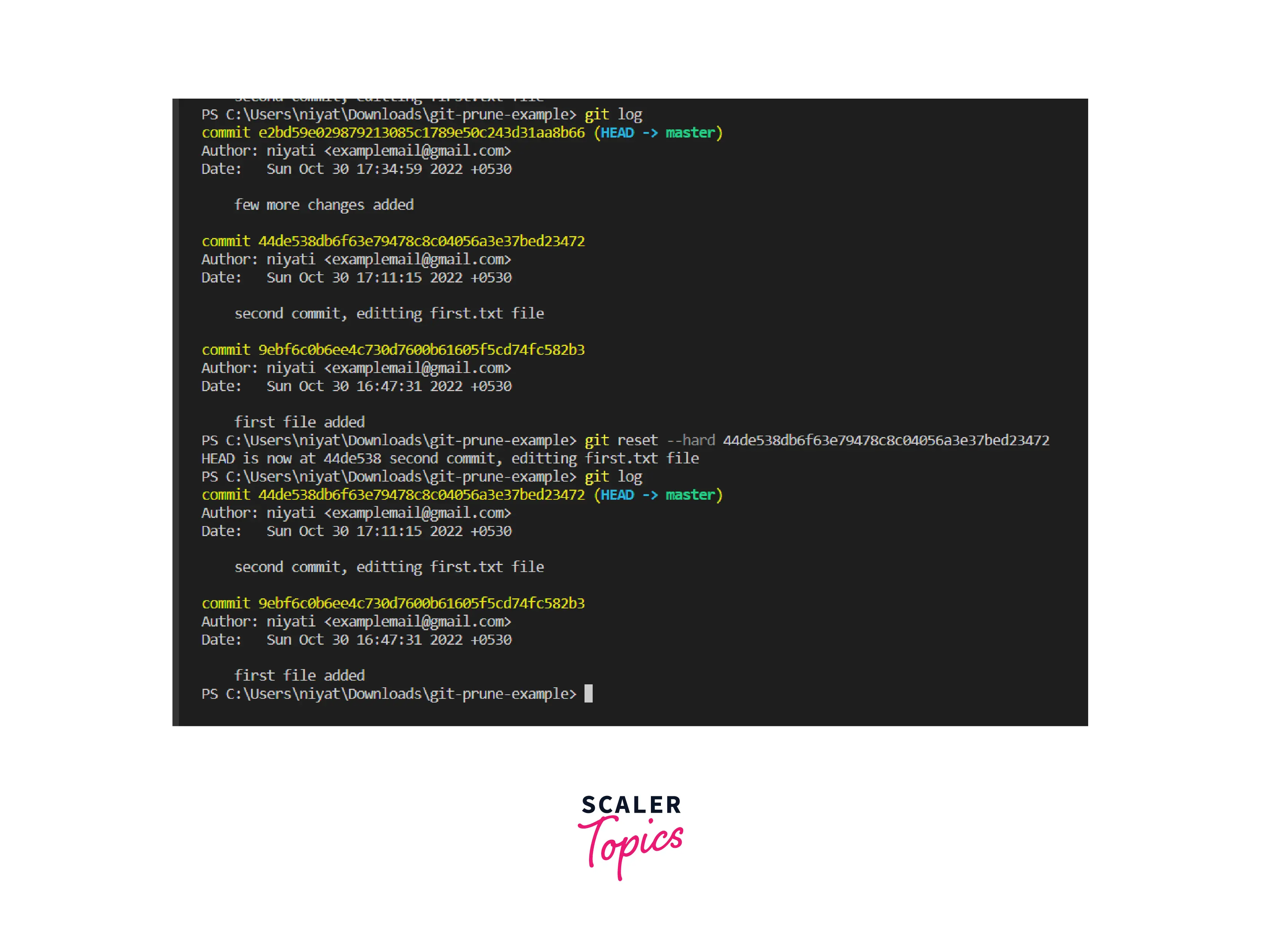 Let us stimulate a scenario where a commit becomes unreachable. The detached commit is not present in the git log and needs to be deleted using the git prune command.
