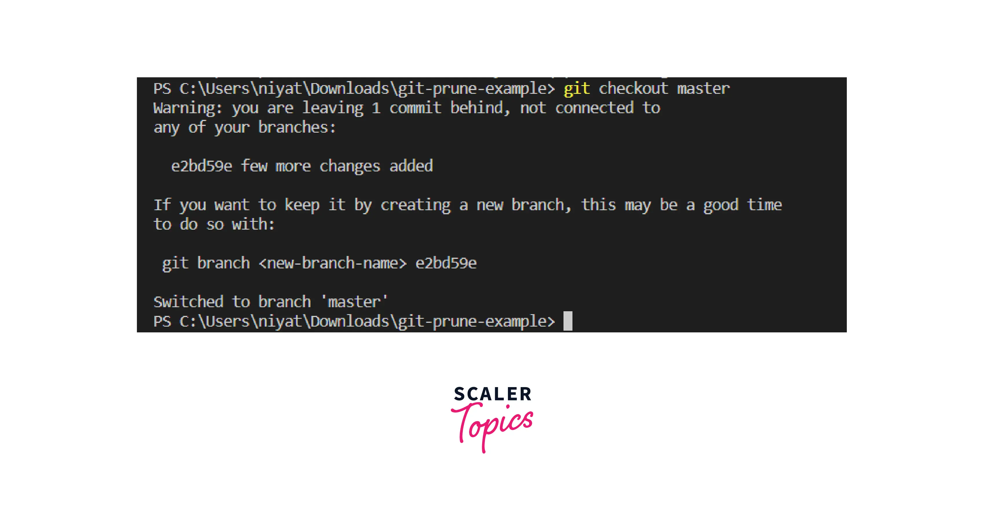 A warning is displayed saying that the current branch is not connected to the master branch and we are leaving it.