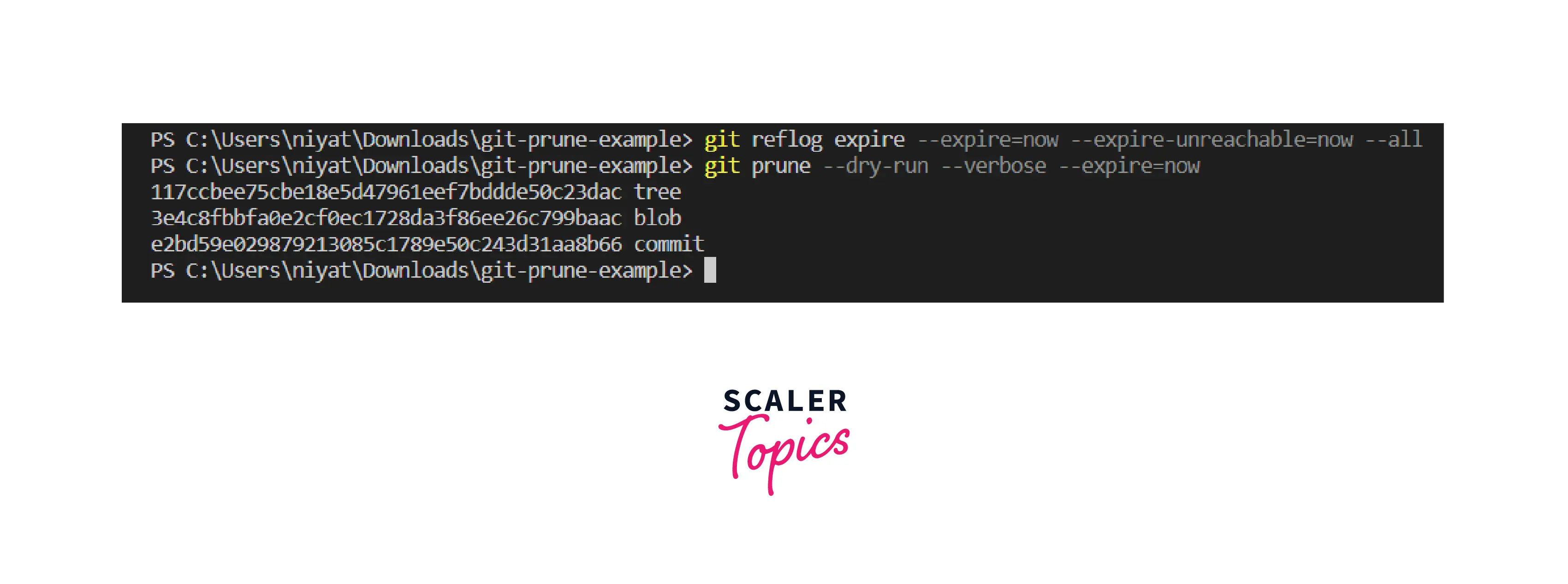 This command will force expire all the entries in the reflog that are older than now i.e. all the previous entries. This command is risky and must not be used by anyone or very frequently. With all the data wiped from the reflog, our repository is ready for executing git prune.