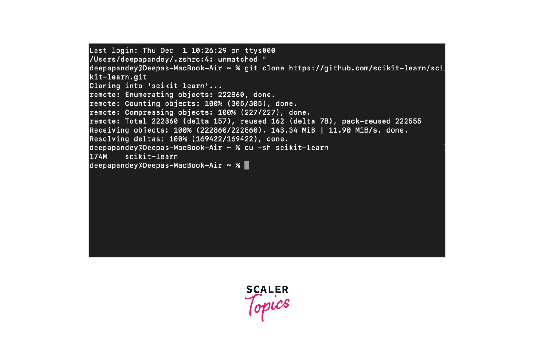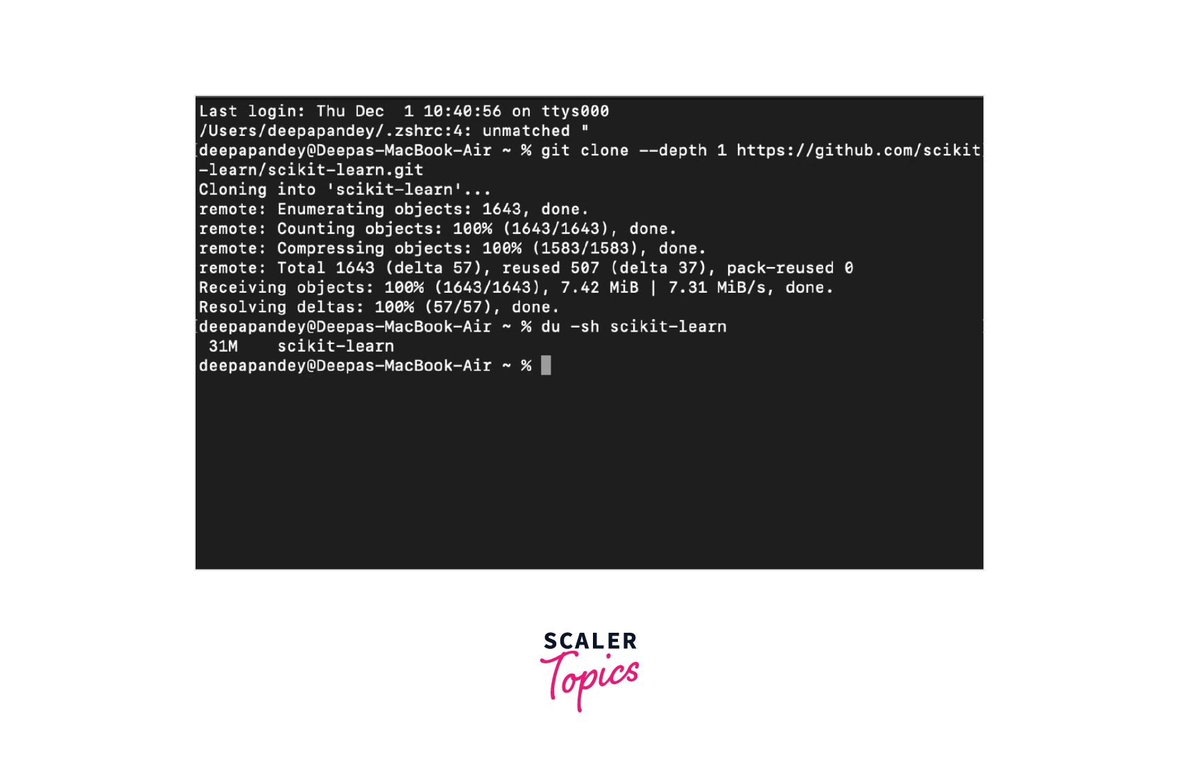 Let us look at an example where we will be cloning a scikit-learn repository in the usual way, and also in a shallow clone way to get a clear understanding of the difference in size in both cases.